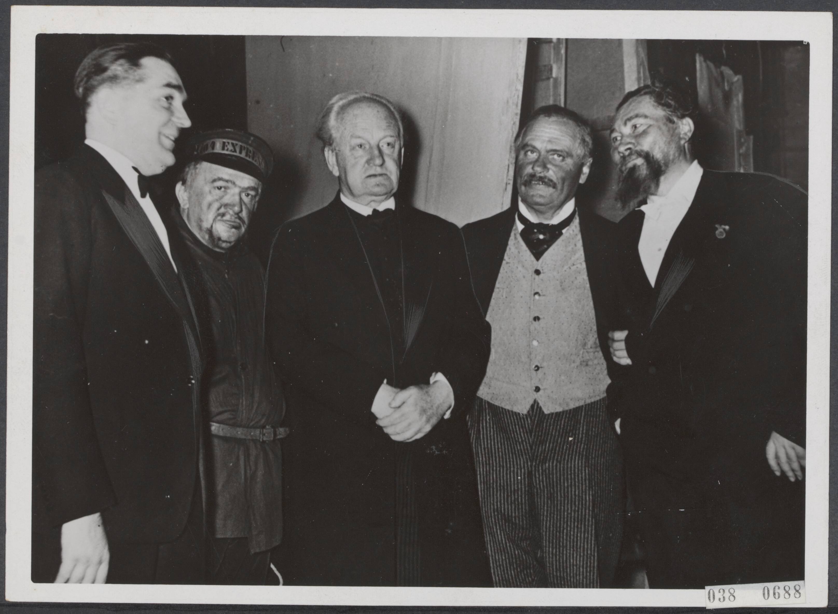 Toneelstuk "Florian Geyer"" van Gerhart Hauptmann door Stadtheater Bochum in de Stadsschouwburg te Den Haag op 31 oktober 1941 en in Utrecht op 1 november 1941. Gerhard Hauptmann met de toneelspelers Ernst Legal, Eduard von Winterstein en Paul Wegener