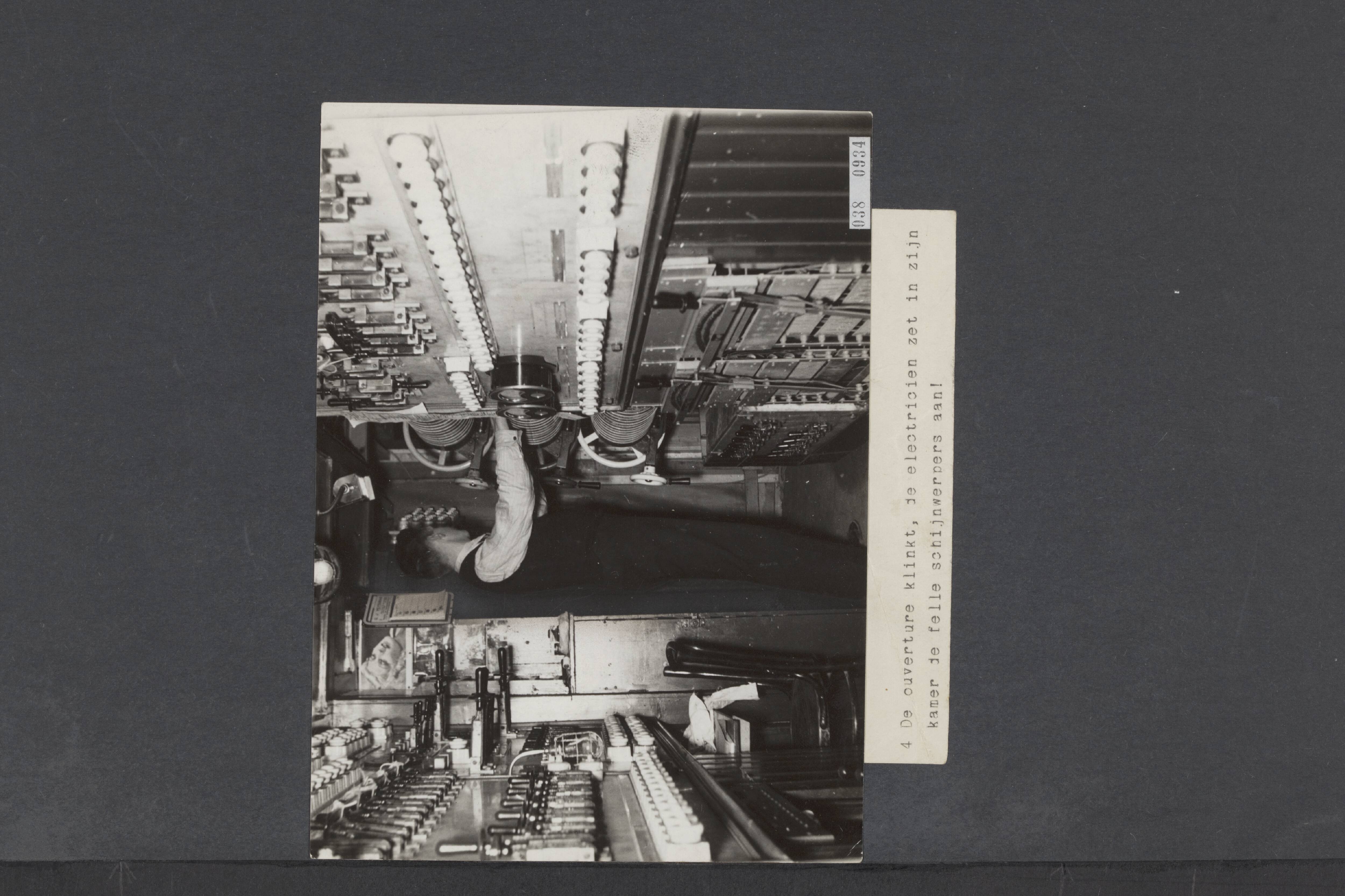 Achter de schermen van de Bouwmeester-revue. De ouverture klinkt, de electricien zet in zijn kamer de felle schijnwerpers aan