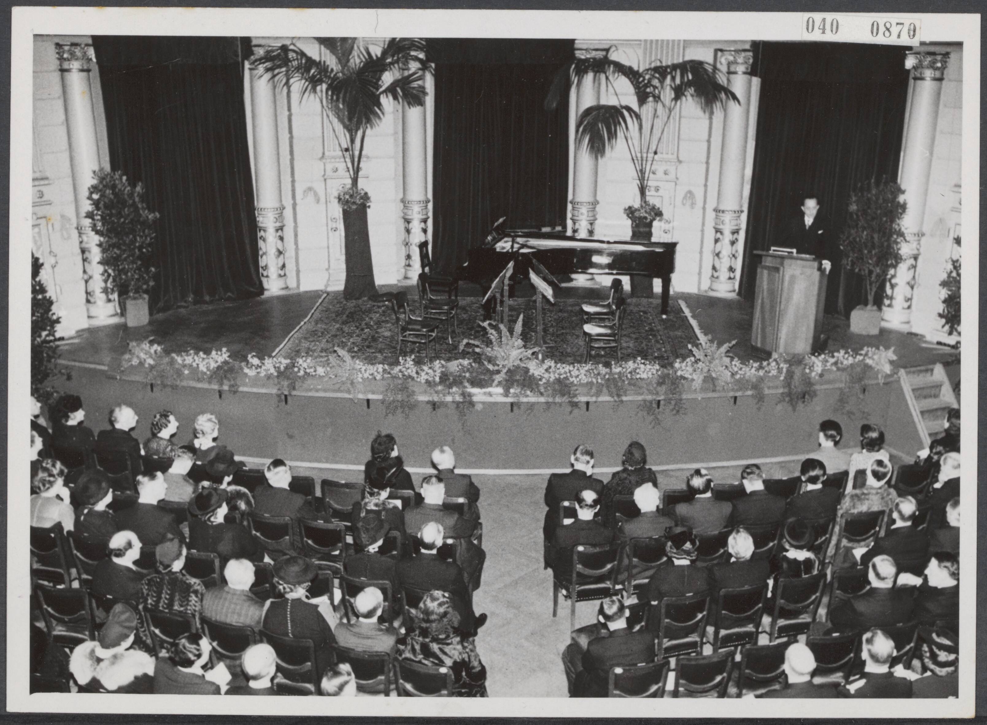 Herdenking in het Concertgebouw te Amsterdam gewijd aan Wolfgang Amadeus Mozart, waarbij prof. Rudolf Mengelberg (broer van Willem Mengelberg) een levensbeschrijving van de componist gaf