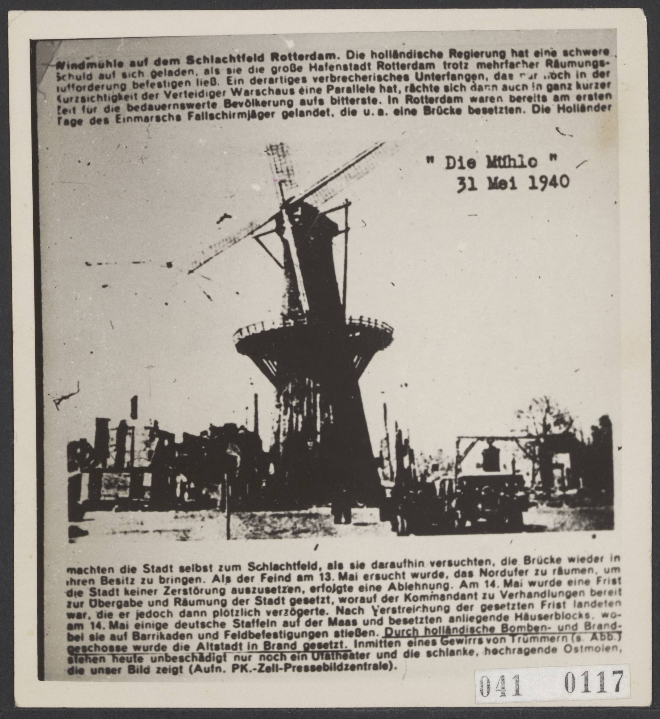 Rotterdam na het Duitse bombardement op 14 mei 1940. Duits artikel over het bombardement met foto (dd. 31-5-1940) van molen aan de Oostzeedijk