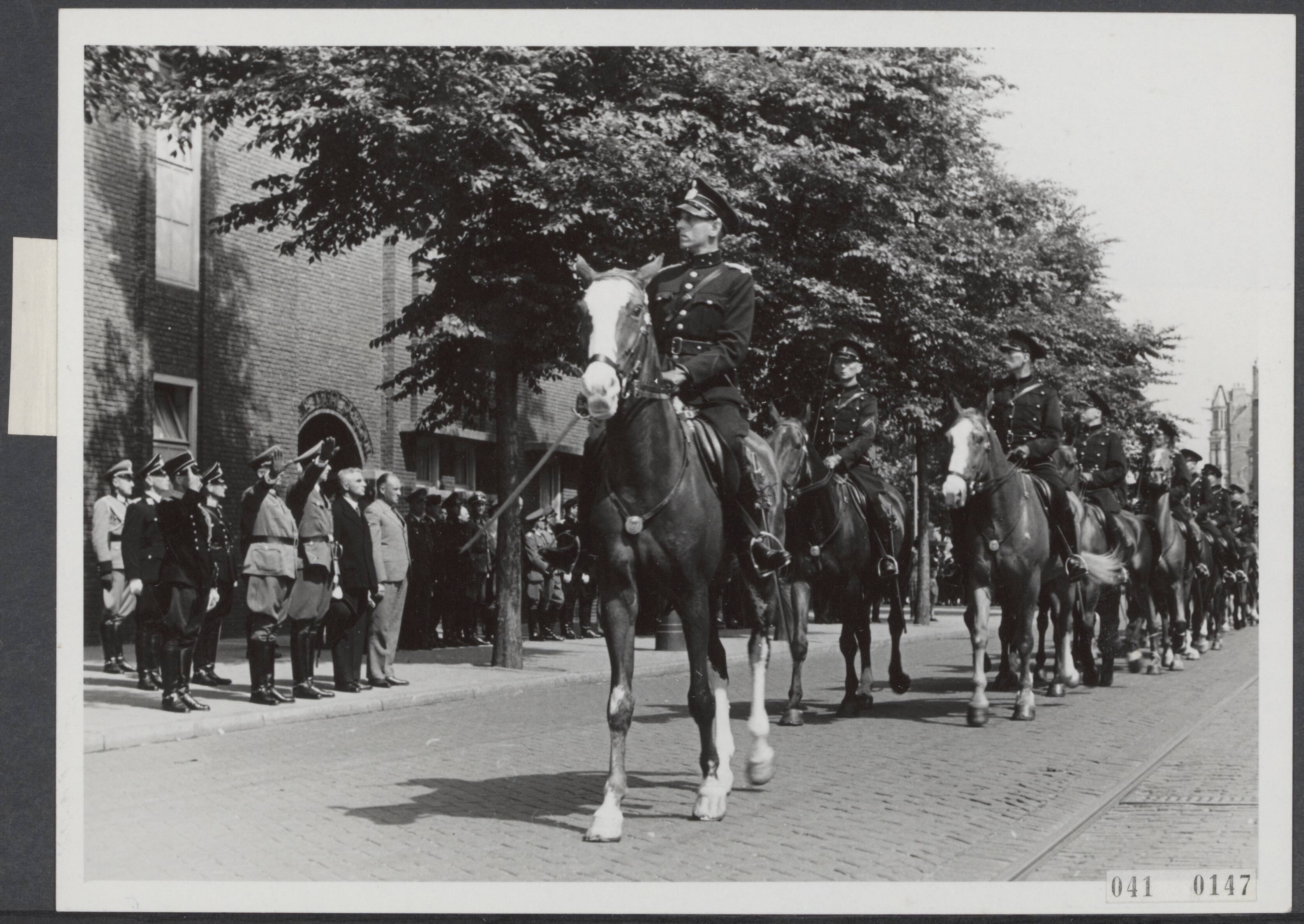 Opening van de nieuwe politiekazerne op het Cornelis Troostplein (hoek Ferdinand Bolstraat) te Amsterdam. De bereden politie trekt voorbij. Van rechts naar links; senator dr. Böhmker, E.J. Voûte, burgemeester van Amsterdam, Brigadeführer Rauter, generaal Schumann en commissaris van politie S. Tulp