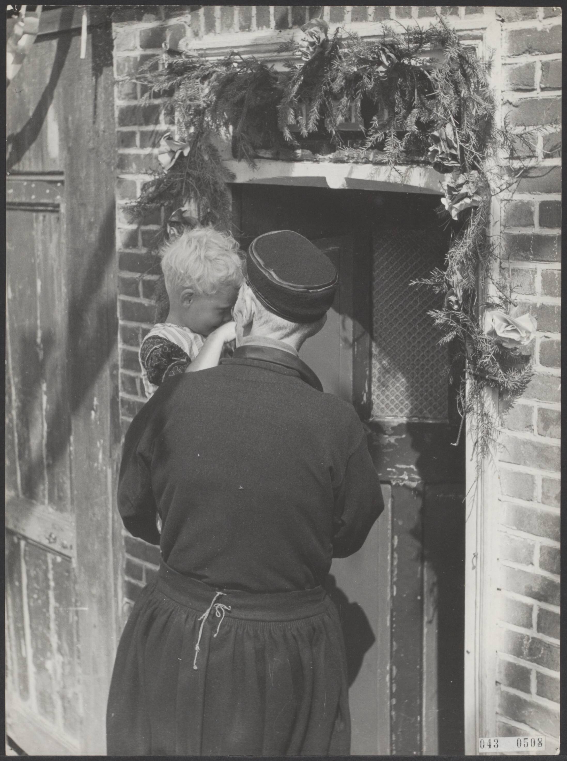 Volendam viert de bevrijding. Man in Volendammer klederdracht met op zijn arm een kind bij een versierde voordeur