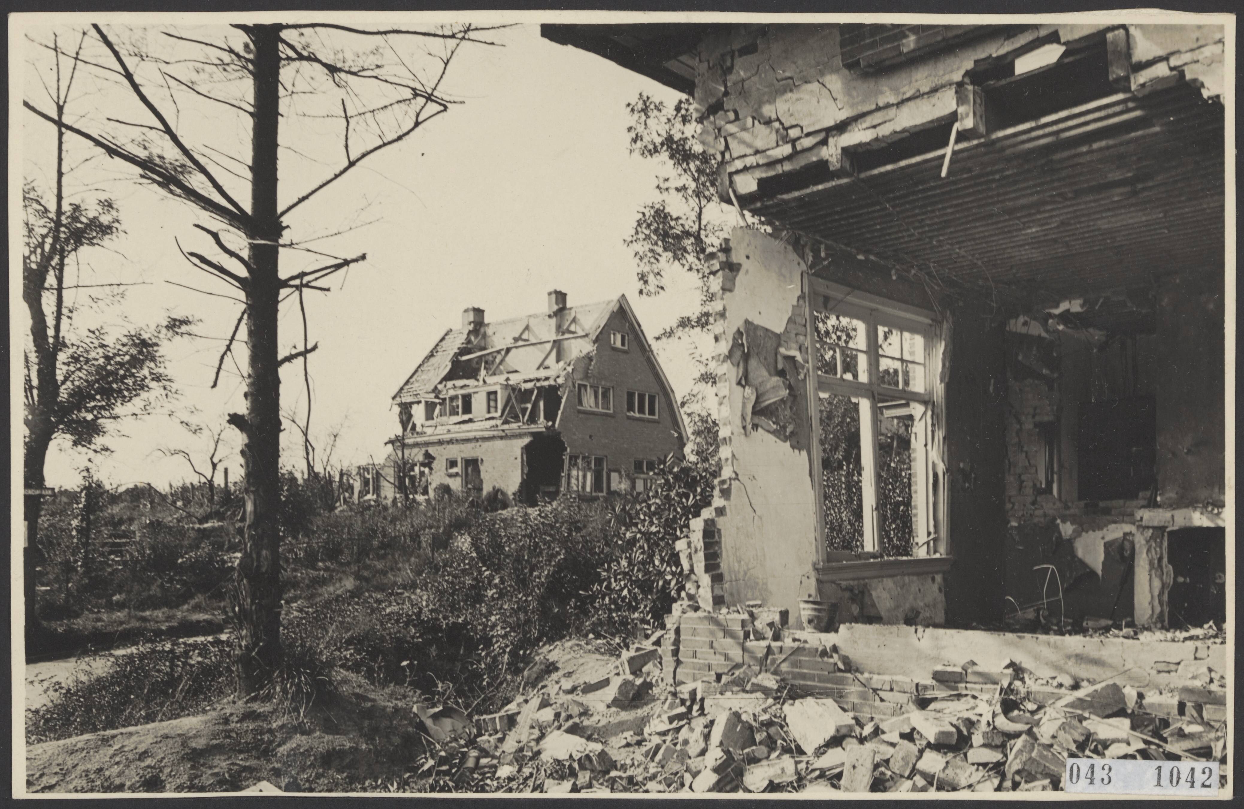 Ruines in Oosterbeek na het einde van de Tweede Wereldoorlog. Acacialaan. Gezien vanaf de Benedendorpsweg
