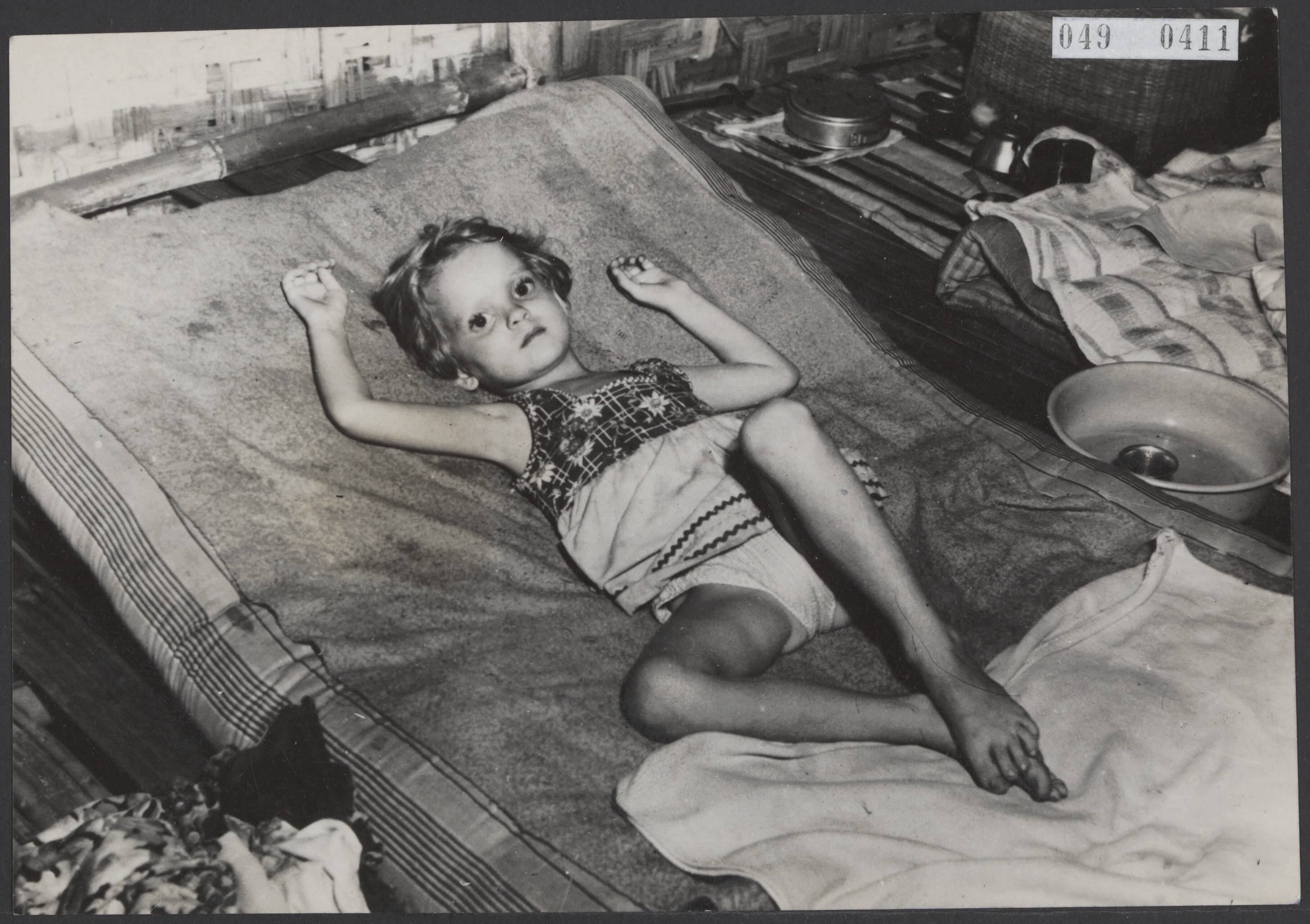 "De eerste opnames die in Australië zijn aangekomen, drie dagen geleden gemaakt in Kampong Makassar, het slechtste interneringskamp in Batavia, waar 10.000 vrouwen en kinderen samengepakt leefden op een ruimte van minder dan de helft van een vierkante mijl. Vrouwen en kinderen wachten op repatriëring. Dit 7-jarige meisje is stervende in het kamphospitaal. Verpleegsters werken in 18 uur durende ploegendiensten om de steeds maar groeiende groep zieken te verplegen. Dit kind ligt al weken op bed, starend naar het plafond, terwijl dokter er alles aan doen om haar leven te redden, maar zij kunnen weinig uitrichten bij gebrek aan middelen
