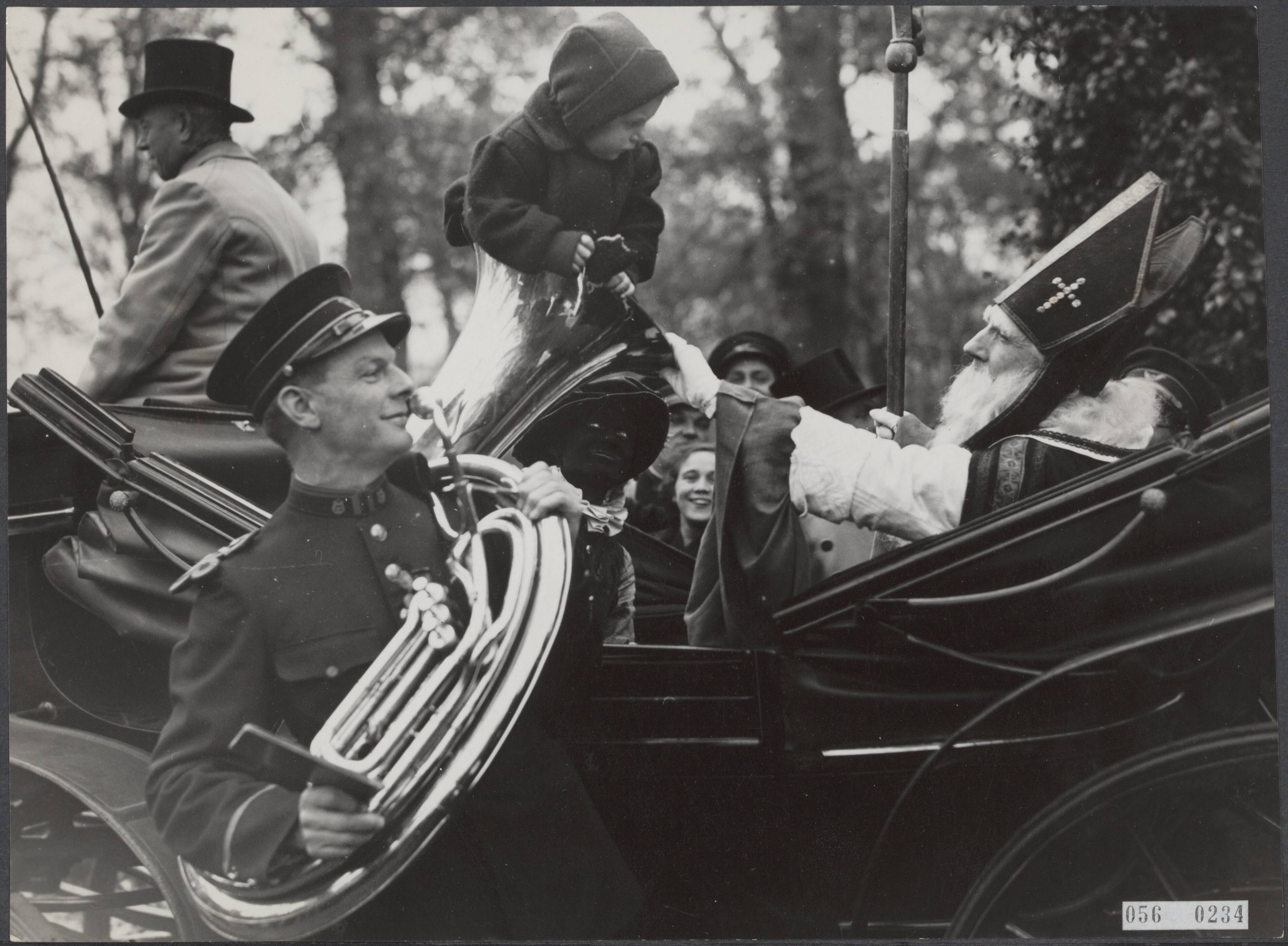 St. Nicolaas arriveerde in de haven van Scheveningen en maakte daarna een rijtocht door de stad. Een jeugdige bewonderaarster kroop in de trompet het is een tuba van het fanfarekrops om toch vooral niet te missen
