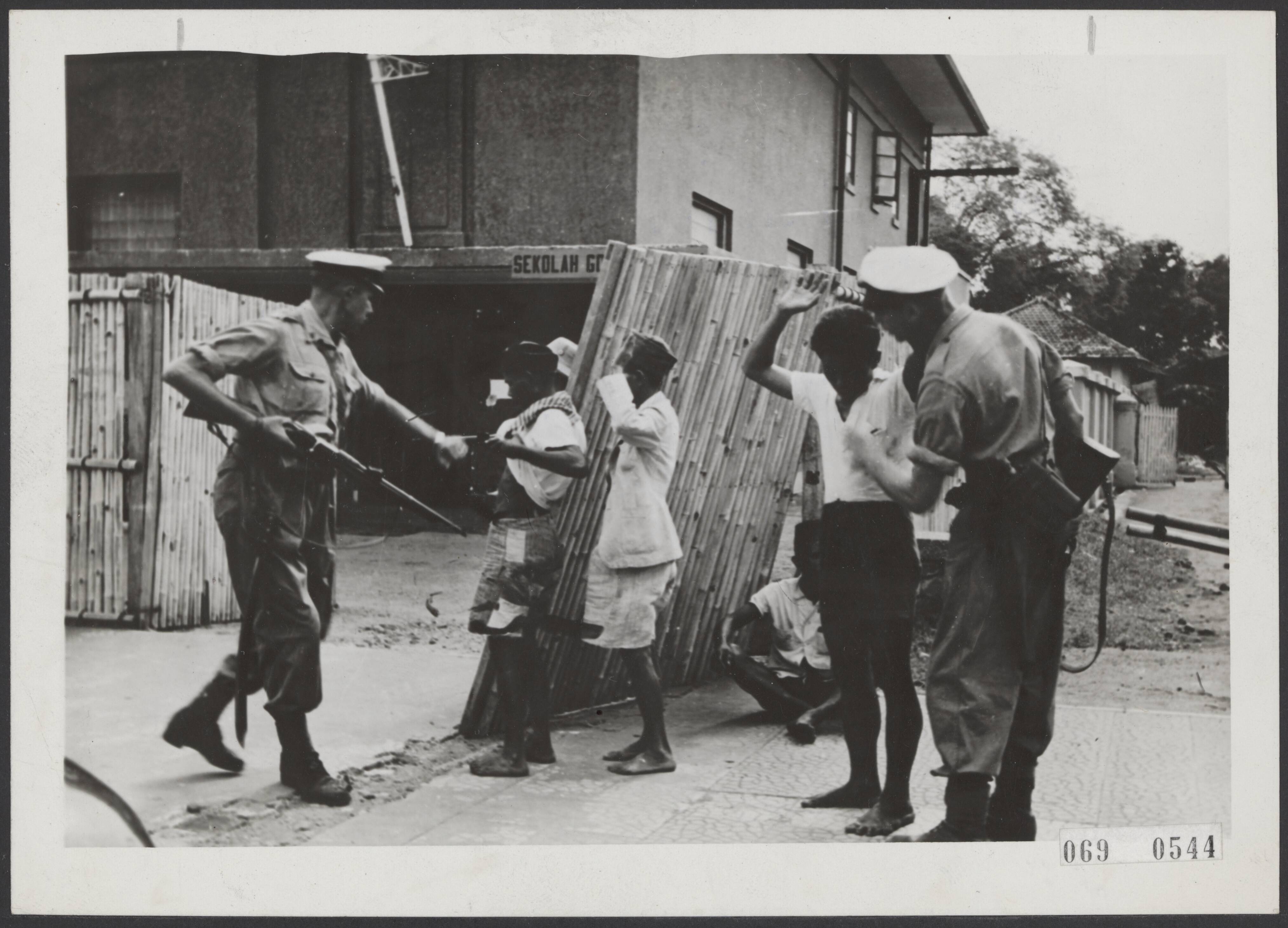 Origineel bijschrift "Halt. Controle. In Batavia is het nog lang niet rustig en op verschillende punten der stad bevinden zich geallieerde controleposten, die alle passerende Indonesiërs op wapen s onderzoeken. Vooral bij het betreden der openbare gebouwen vinden deze controles plaats en dat de soldaten geen half werk doen toont deze foto wel overduidelijk" Schoolkinderen worden gecontroleerd door militairen