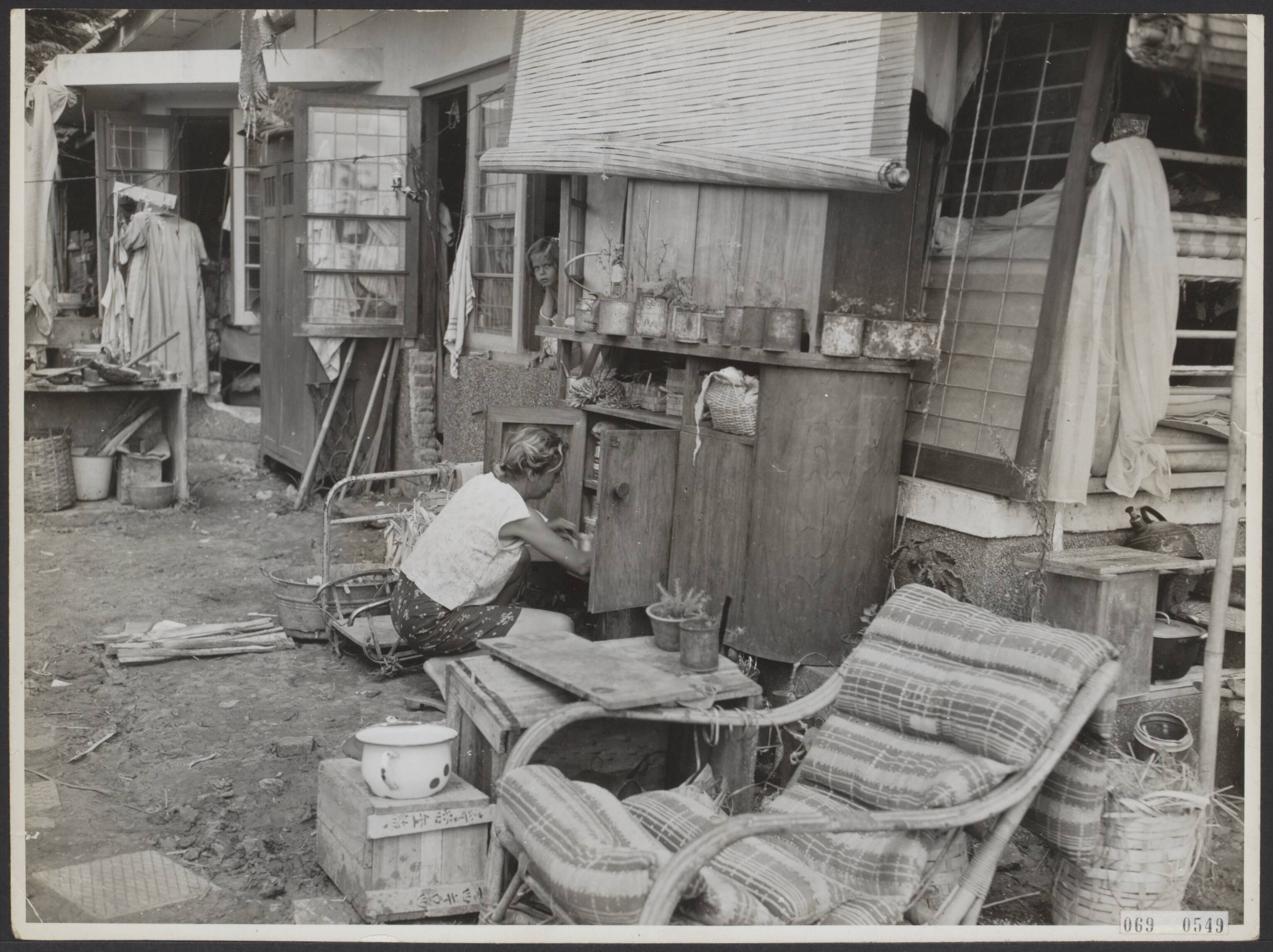 Origineel bijschrift "A woman internee at Tjideng camp, notorious as one of the worst in Java.