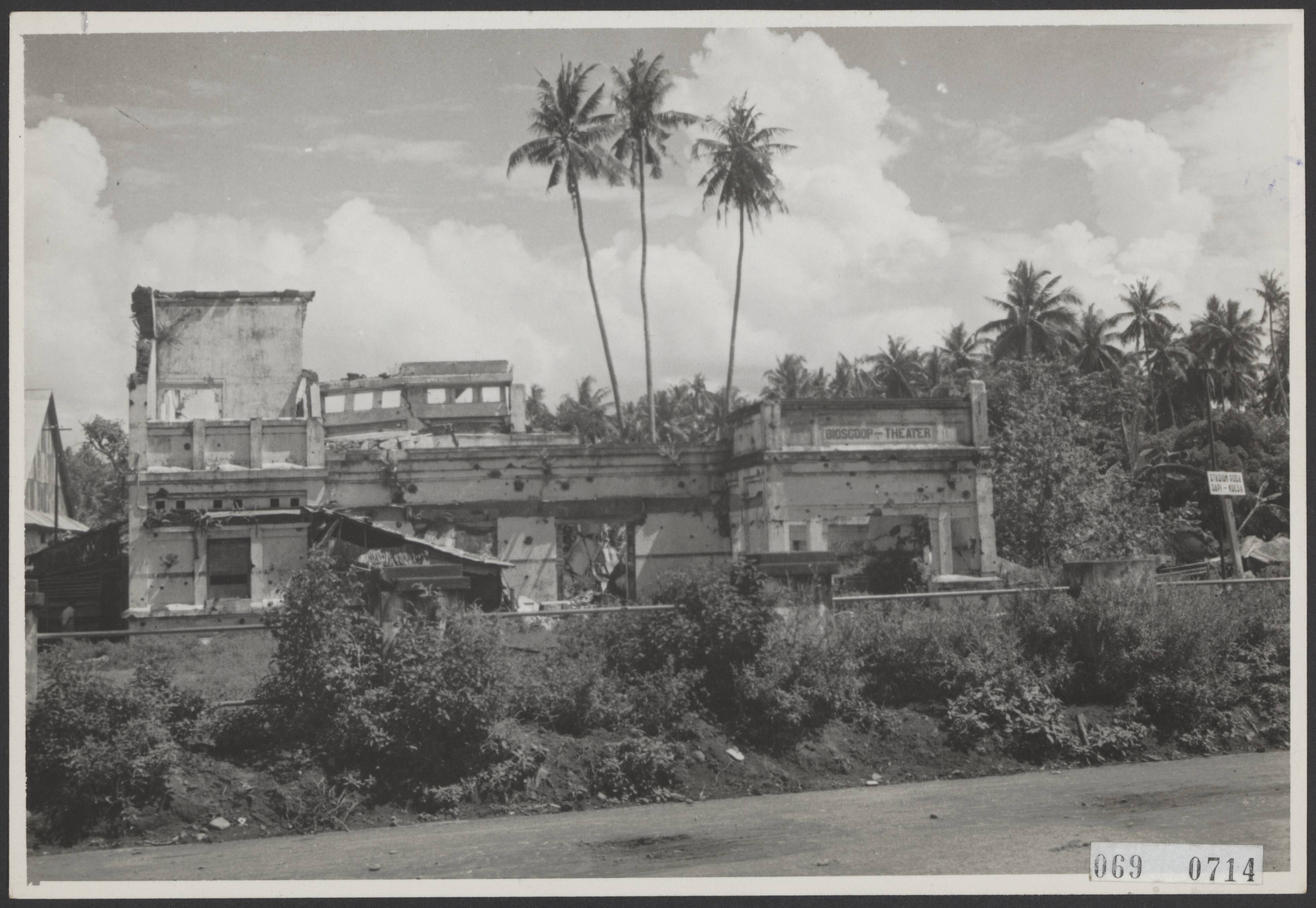 Celebes. Verwoeste bioscooptheater, waarschijnlijk te Menado