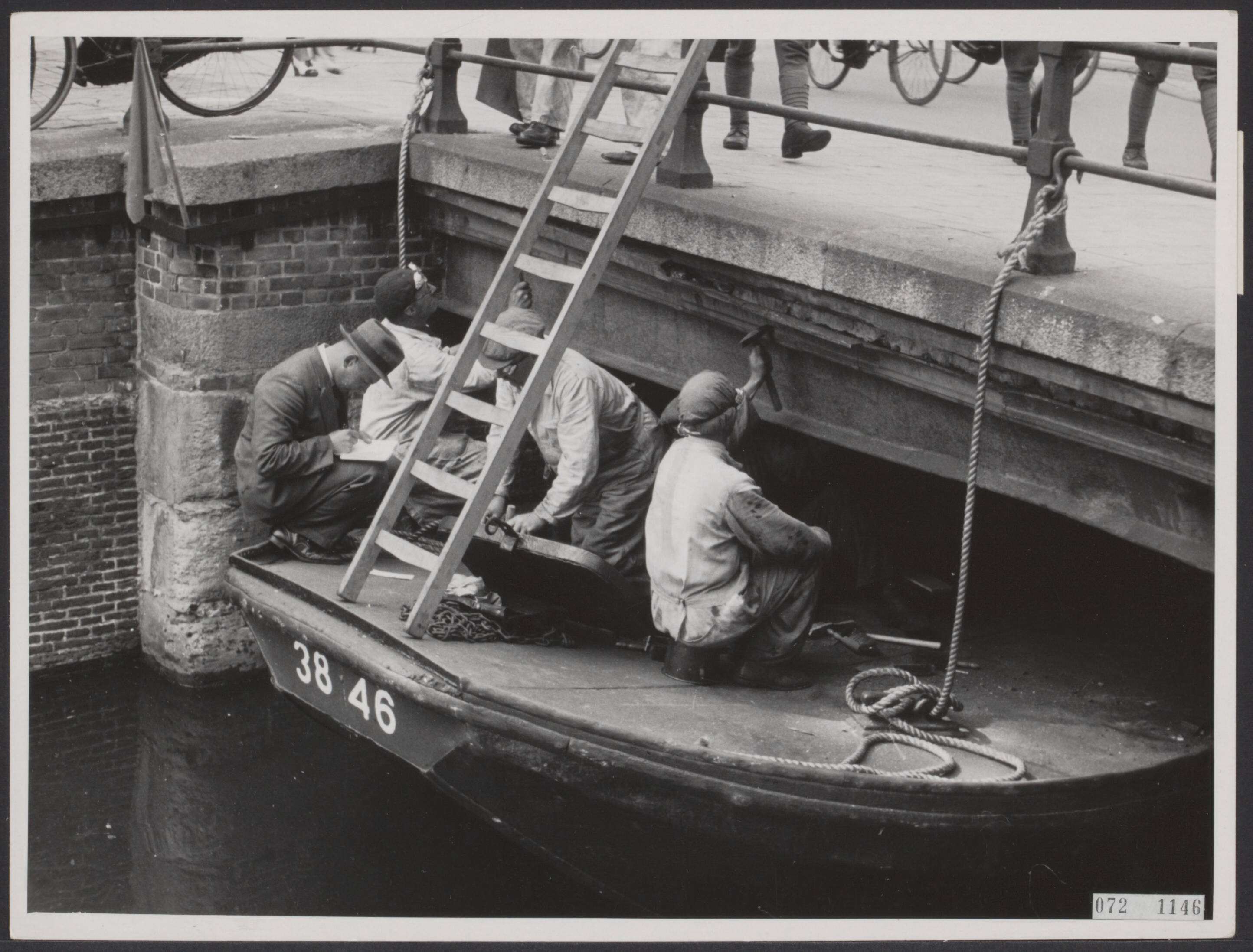 De 400 bruggen van Amsterdam krijgen - alhoewel door de loop van gebeurtenissen later dan was vastgesteld - weer eens een goede beurt. Een der ploegen bij hun "opknappings" werk
