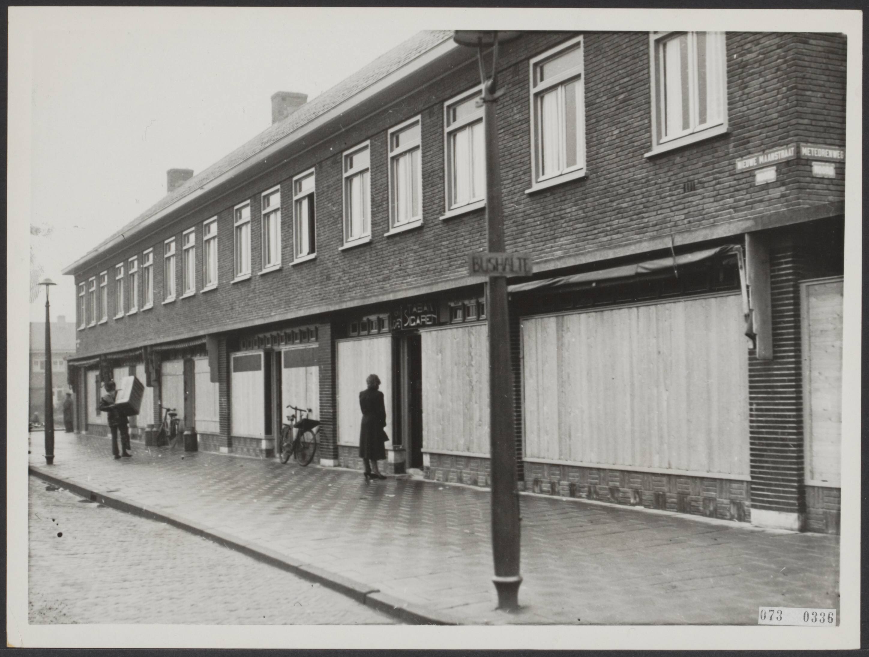 Vele gezinnen verlaten thans het zo zwaar de Engelse bombardementen getroffen tuindorp Oostzaan. De winkeliers namen overal voorzorgsmaatregelen. Geblindeerde ramen winkelstraat Nieuwe Maanstraat hoek Meteorenweg