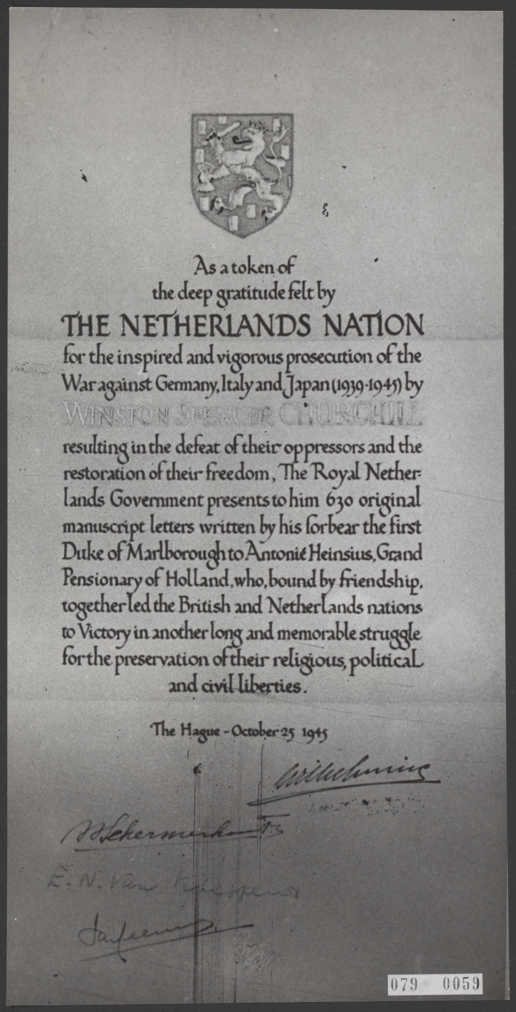 Dankbetuiging van Nederland aan Winston Churchill. Foto van document.