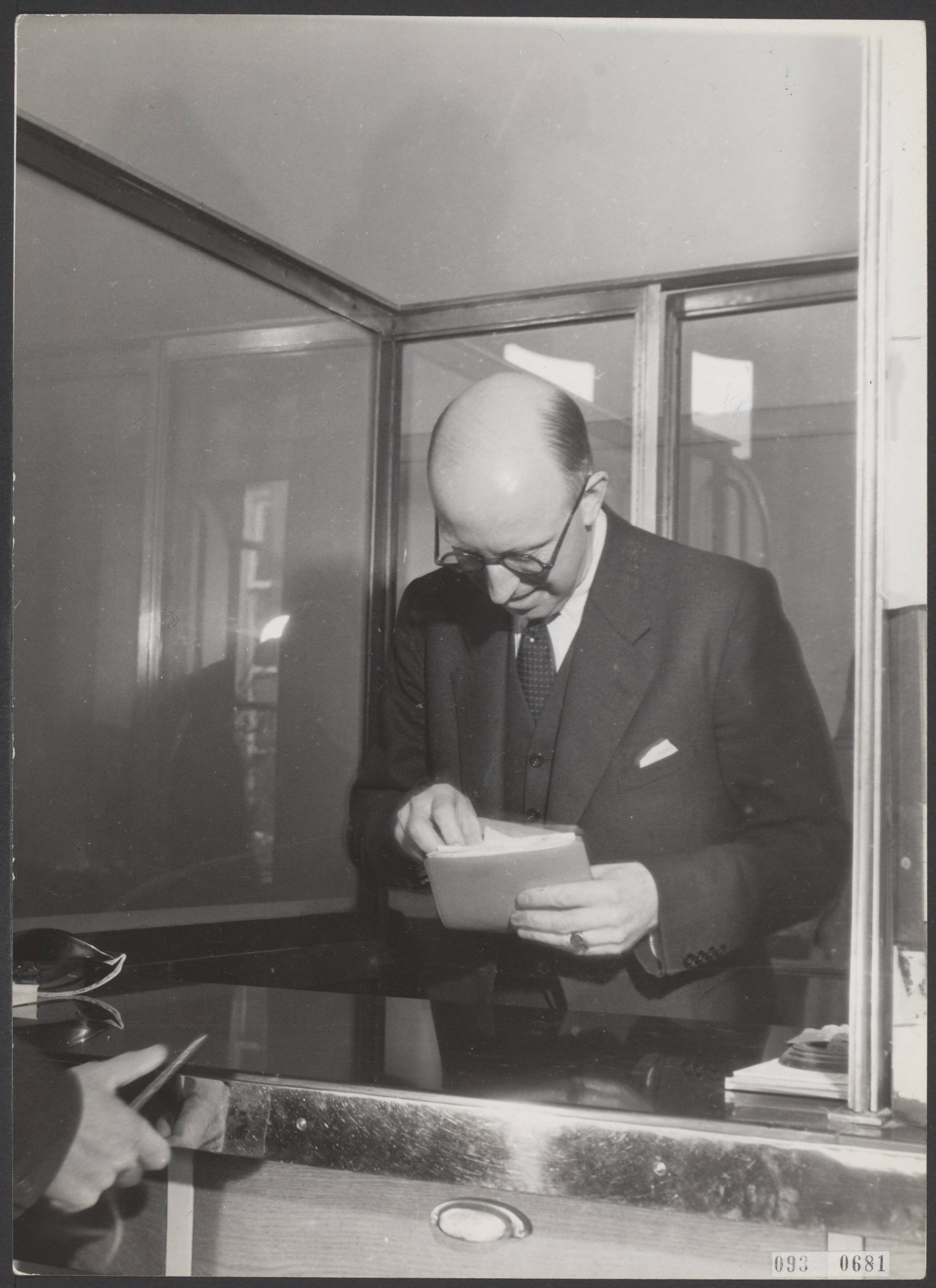 P. Lieftinck, minister van Financiën. levert zijn papiergeld in tijdens de geldzuivering ("tientje van Lieftinck")