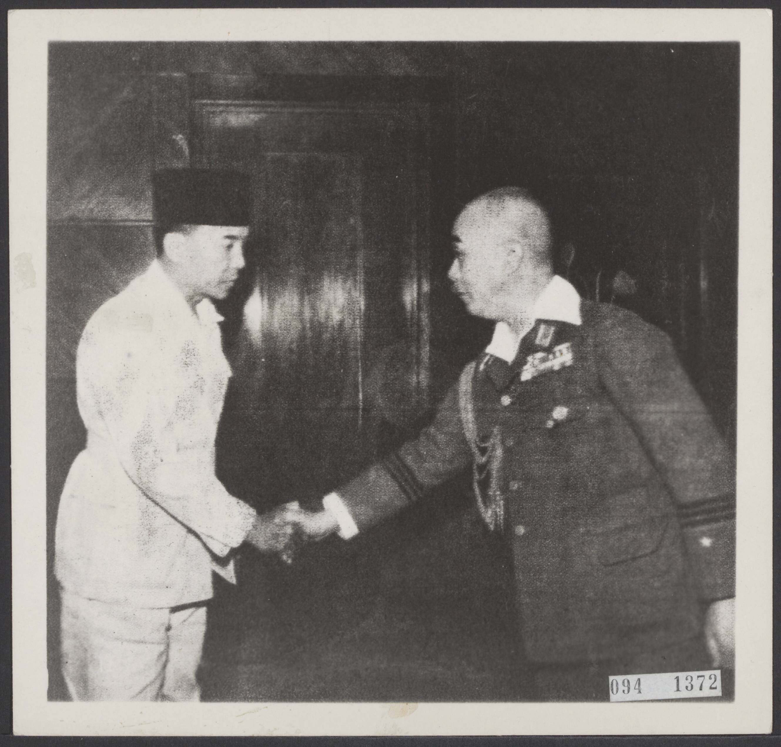 Soekarno (links), president van de Volksraad (Tyuuosangi-in) schudt de hand van de Japanse directeur van Binnenlandse Zaken voor bezet Nederlands-Indié, generaal-majoor Moichiri Yamamoto