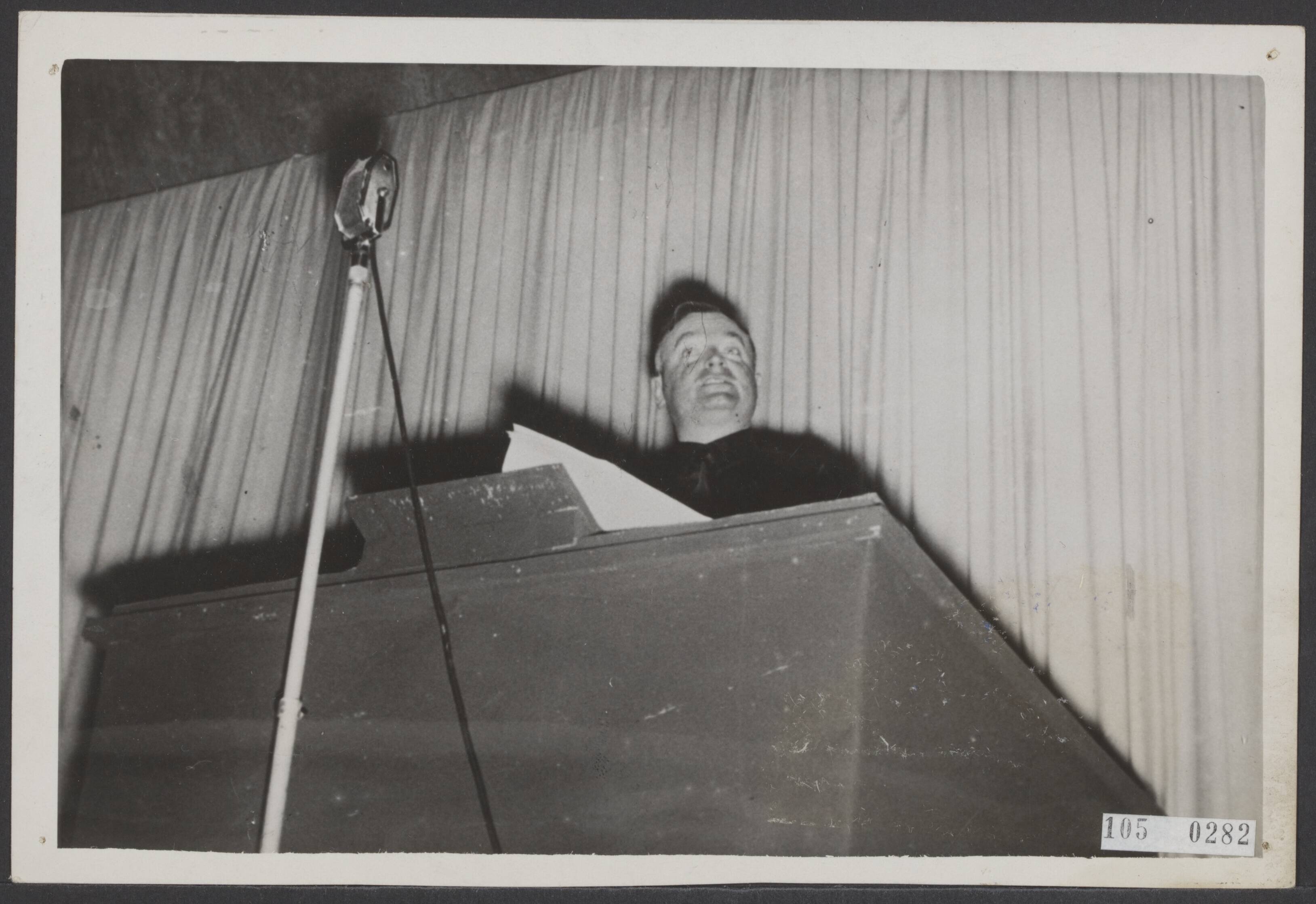 Werkersvergadering te Arnhem door de NSB in een tent op Onderlangs. De leider der NSB, ir. A.A. Mussert presenteert