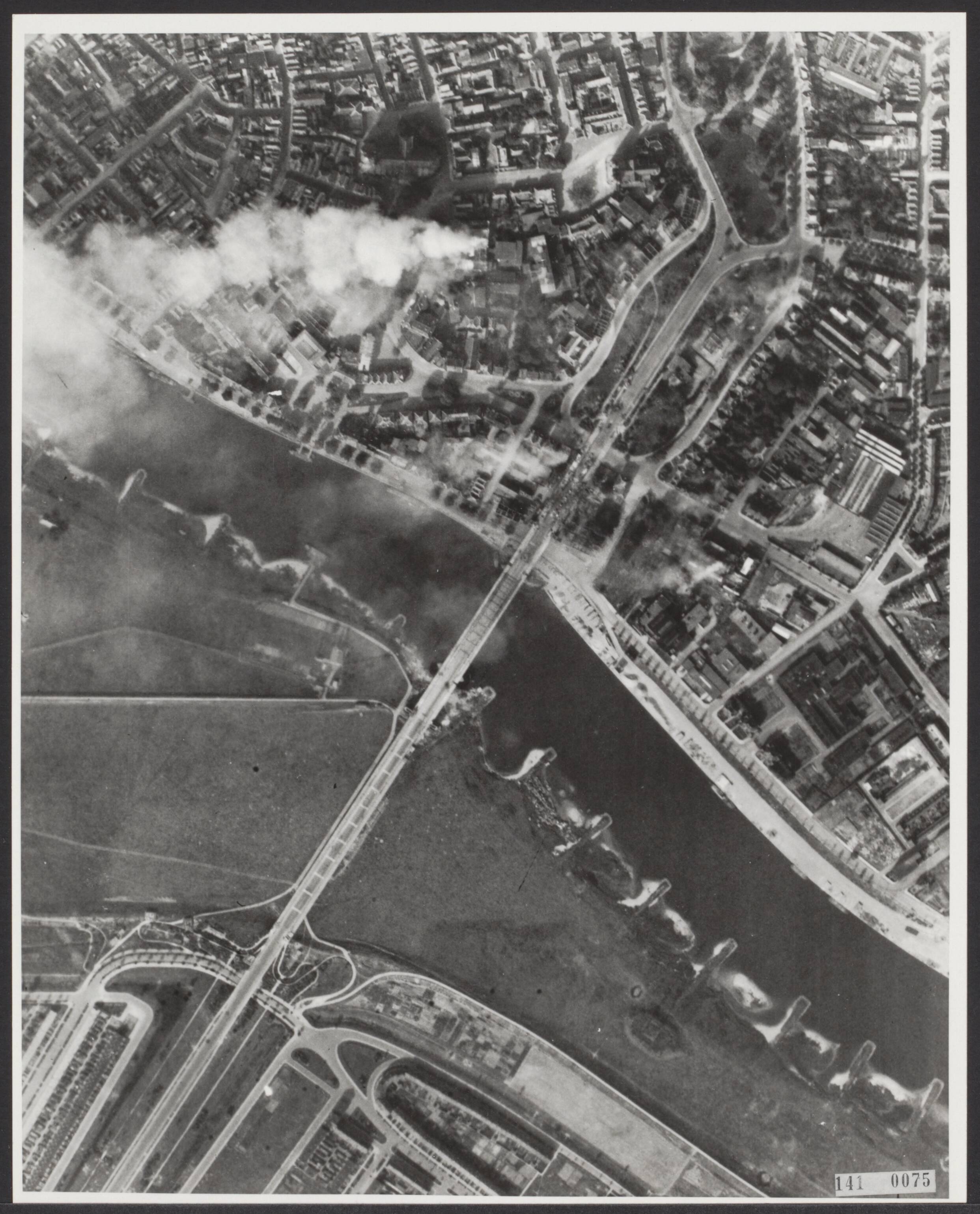 Luchtopname Operatie Market Garden De gevechten op de brug in Arnhem.