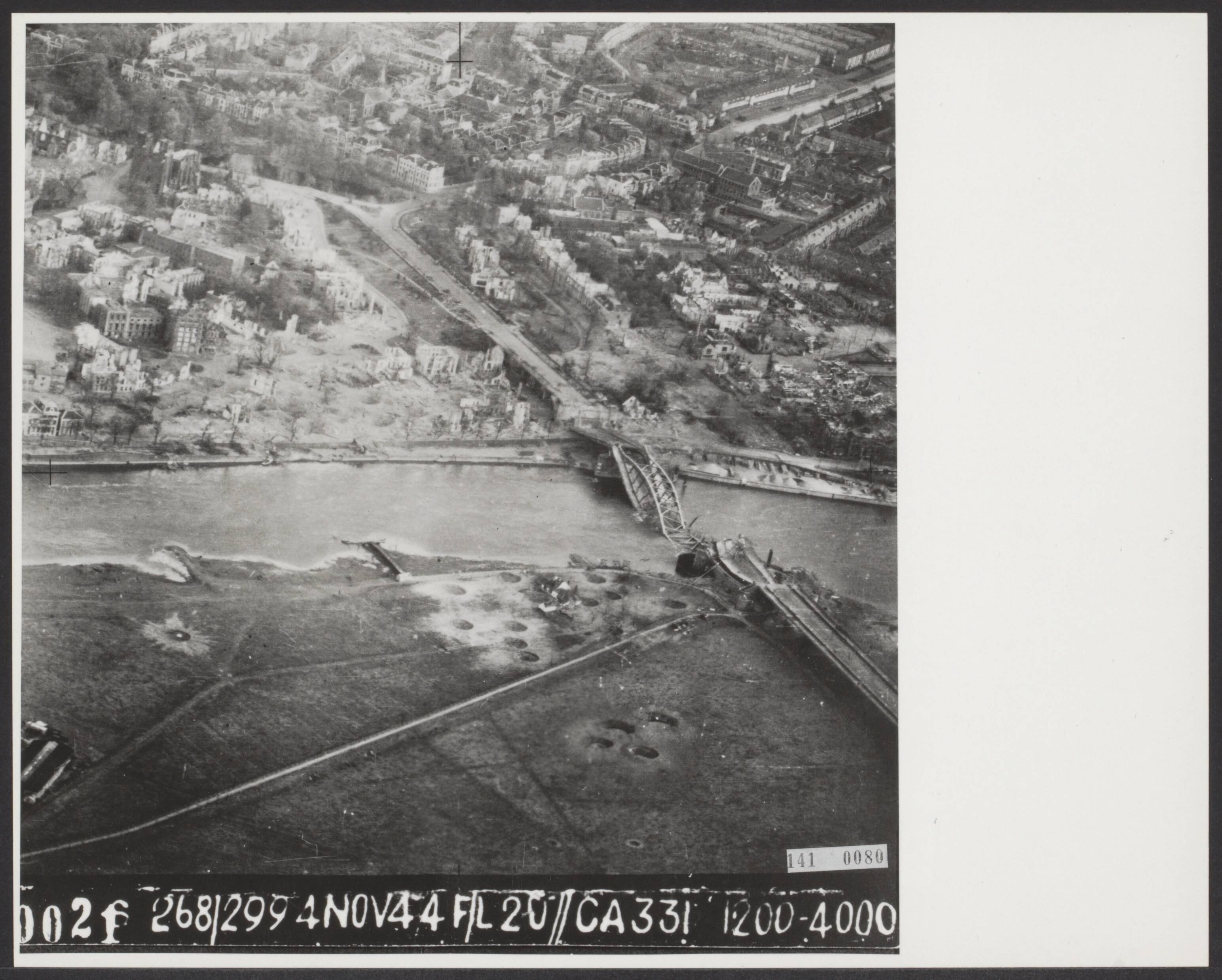 Luchtopname. Opname van een verkenningsvliegtuig van de ravage rond de door de Duitsers opgeblazen brug in Arnhem. Bijna alle huizen en gebouwen bij de brug zijn verwoest, en het gebied vertoont reusachtige bomkrater van het Amerikaanse bombardement van enkele weken daarvoor