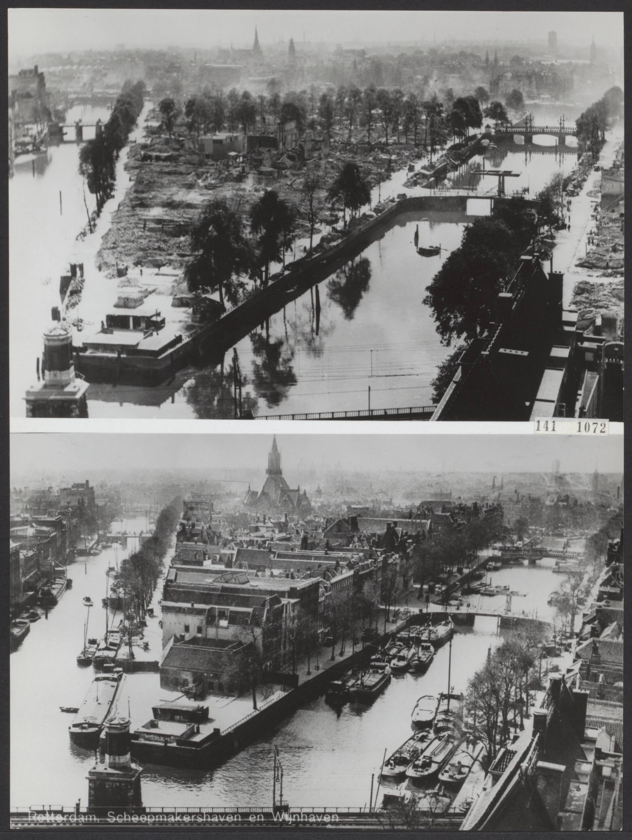 Rotterdam. Situatie voor en na het bombardement. Scheepmakershaven en Wijnhaven