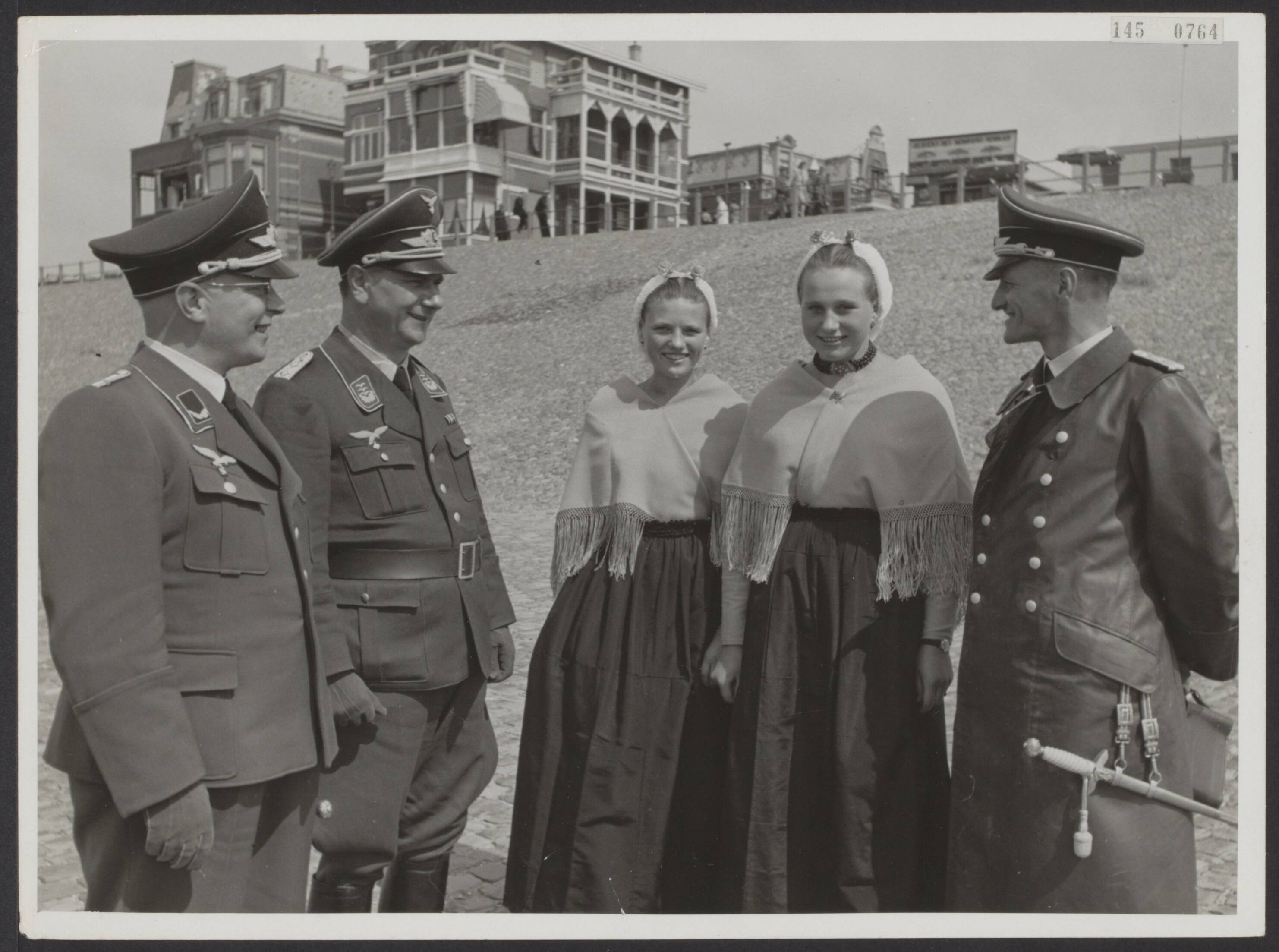 Duitse officieren bewonderen de fraaie klederdrachten van de Scheveningse vissersmeisjes