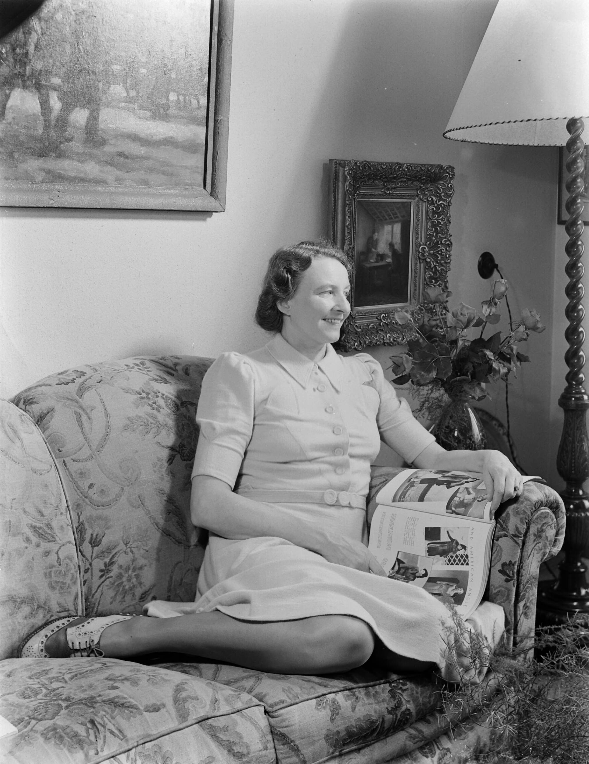Mevrouw D. Smit poserend op een bank met tijdschrift