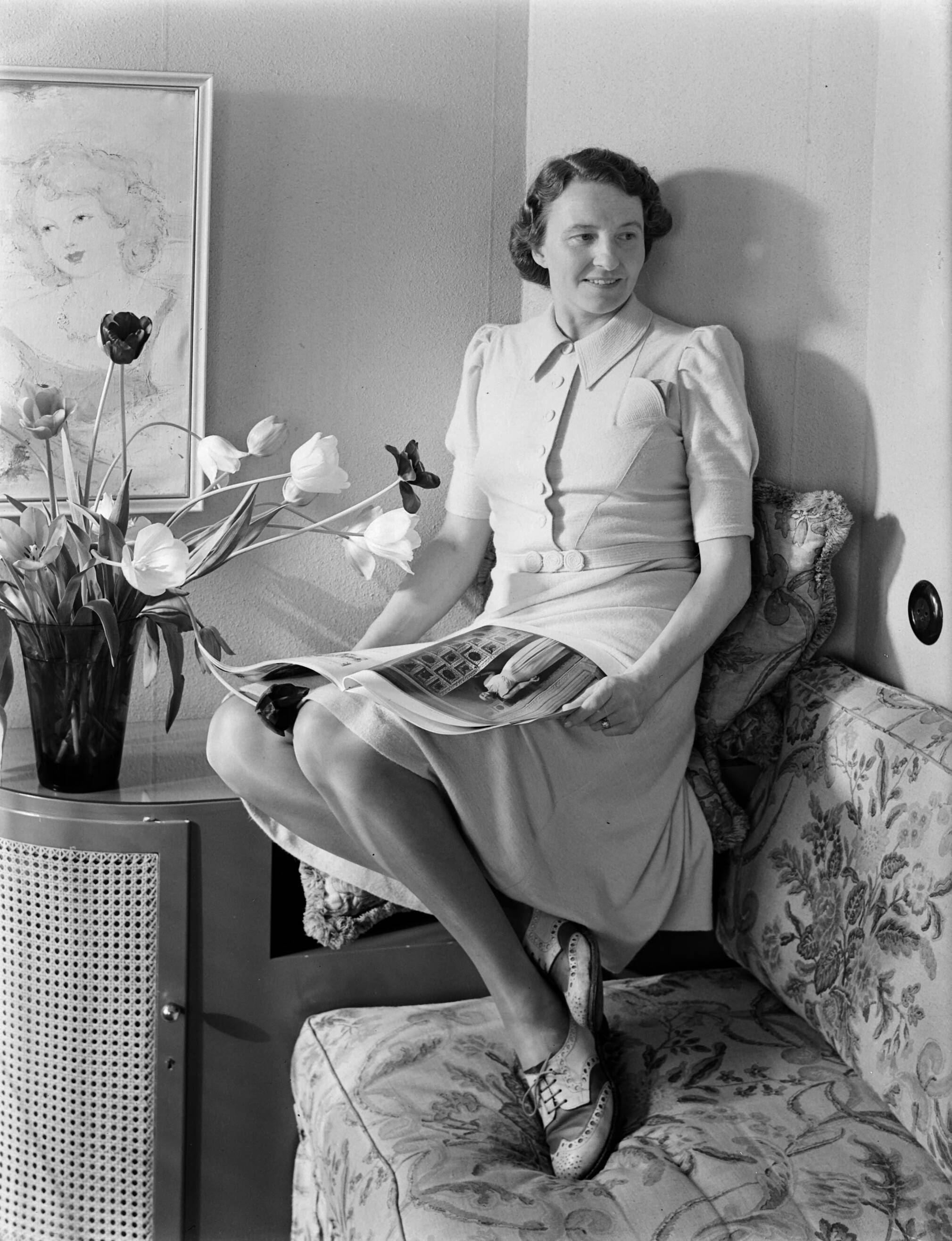 Mevrouw D. Smit poserend op een bank met tijdschrift
