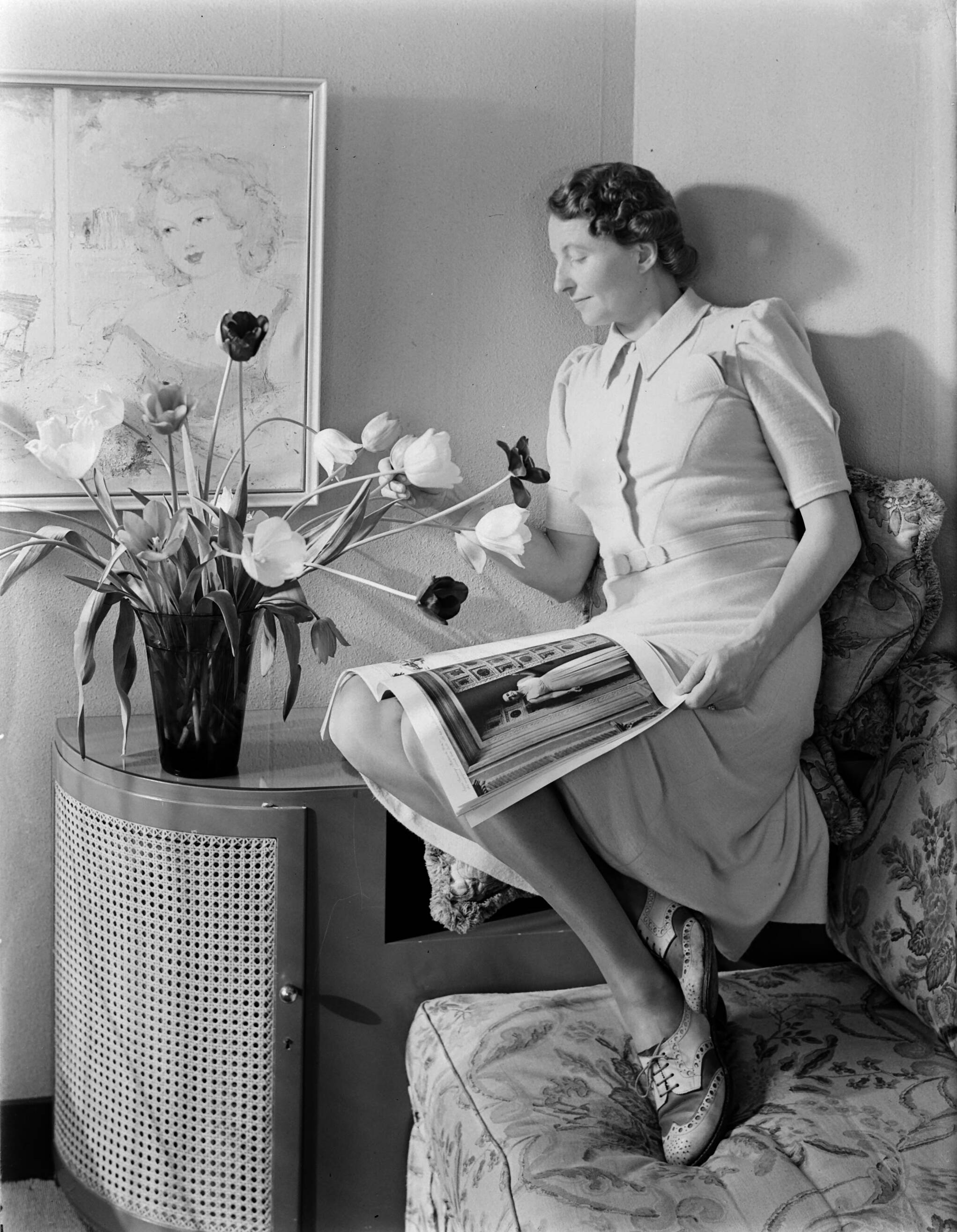 Portret van mevrouw Smit, poserend op de leuning van een bank met tijdschrift