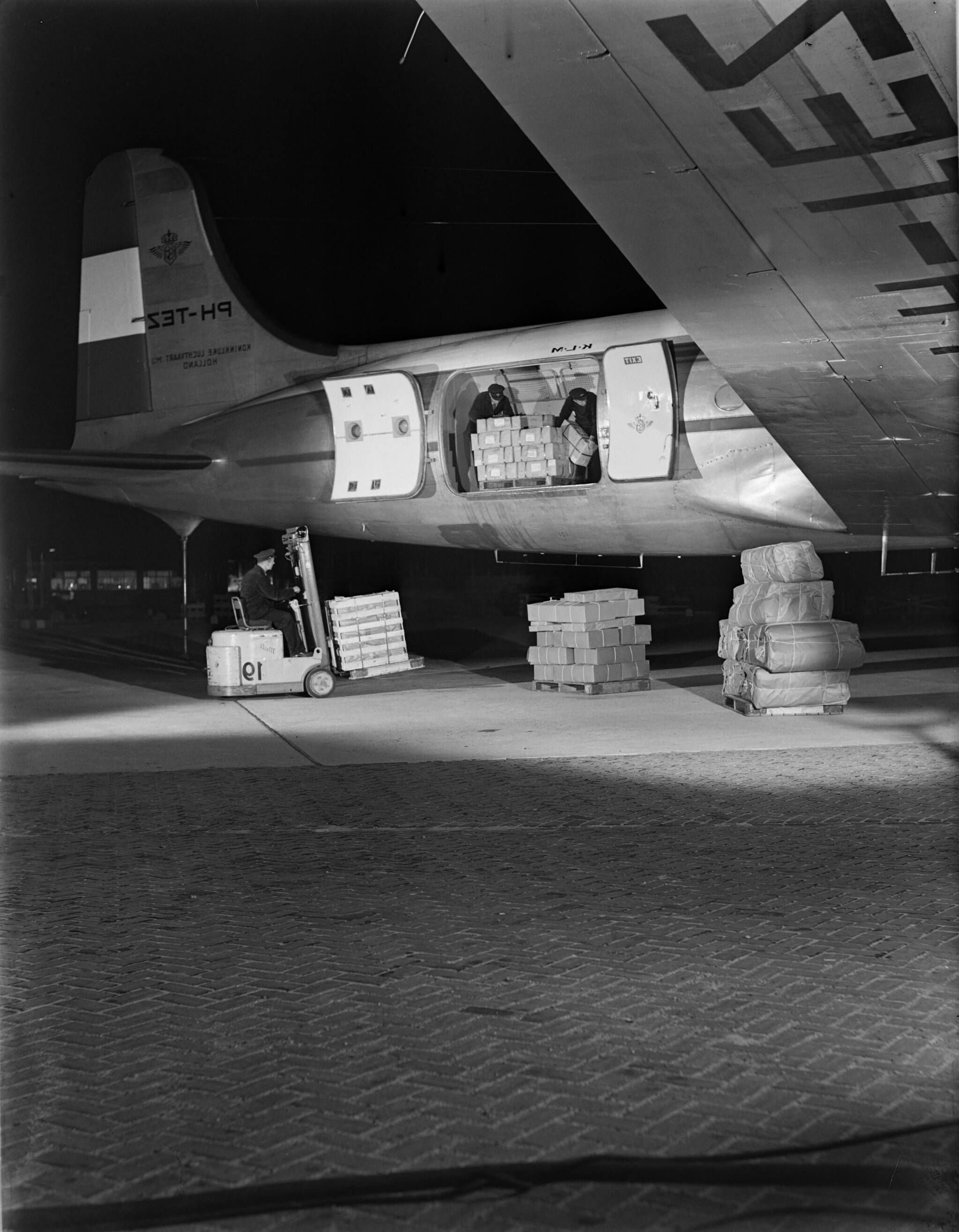 Luchthavenpersoneel bezig met laden of lossen van vracht van een DC-4 van KLM
