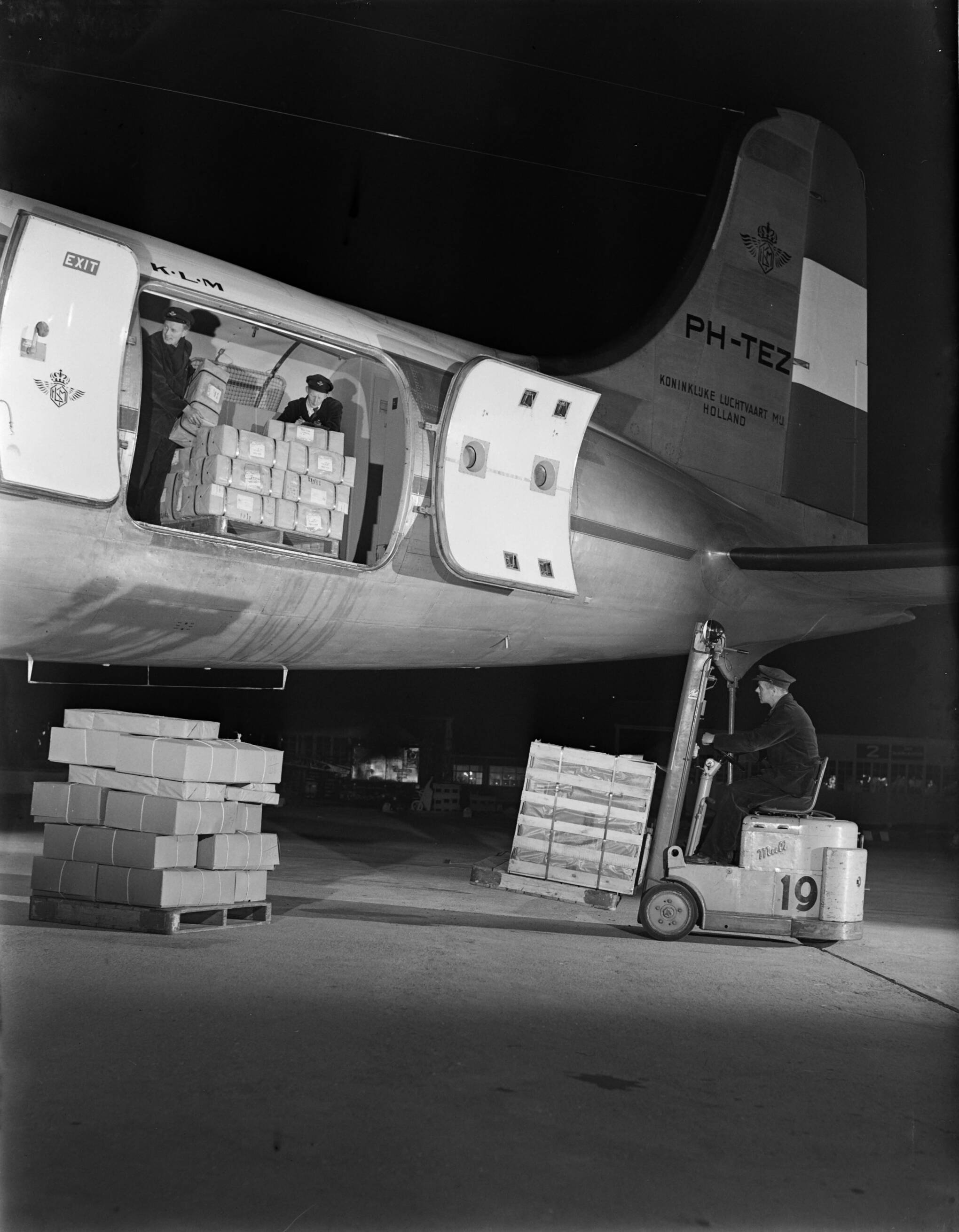 Luchthavenpersoneel bezig met laden of lossen van vracht van een DC-4 van KLM
