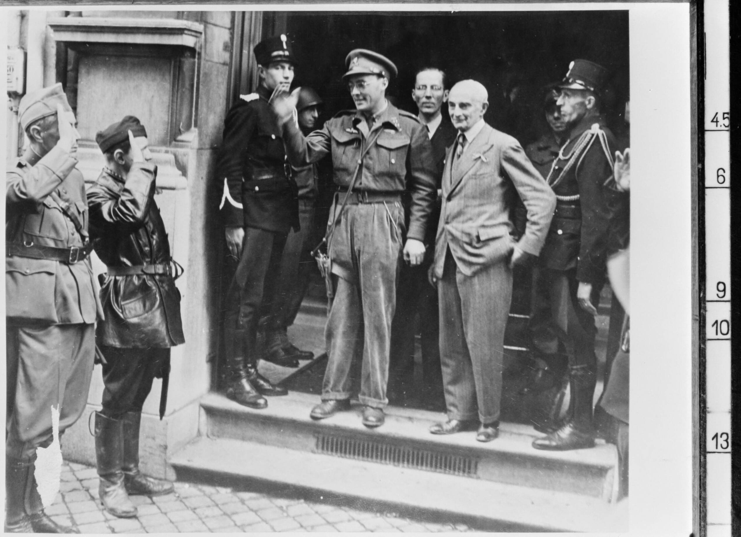 Foto van prins Bernhard die een erewacht groet na de bevrijding