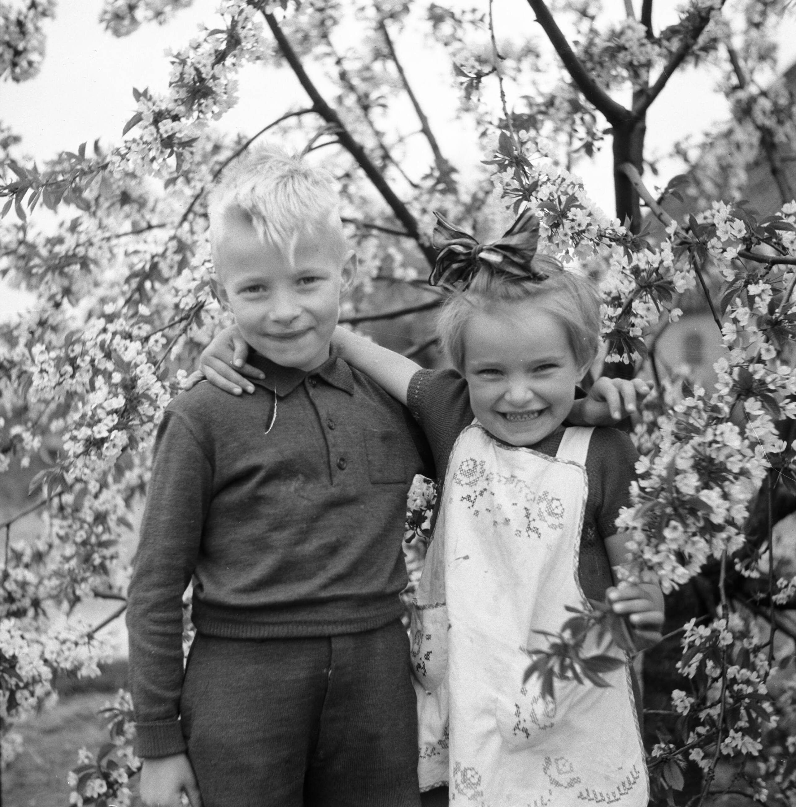 Twee kinderen bij een bloeiende boom