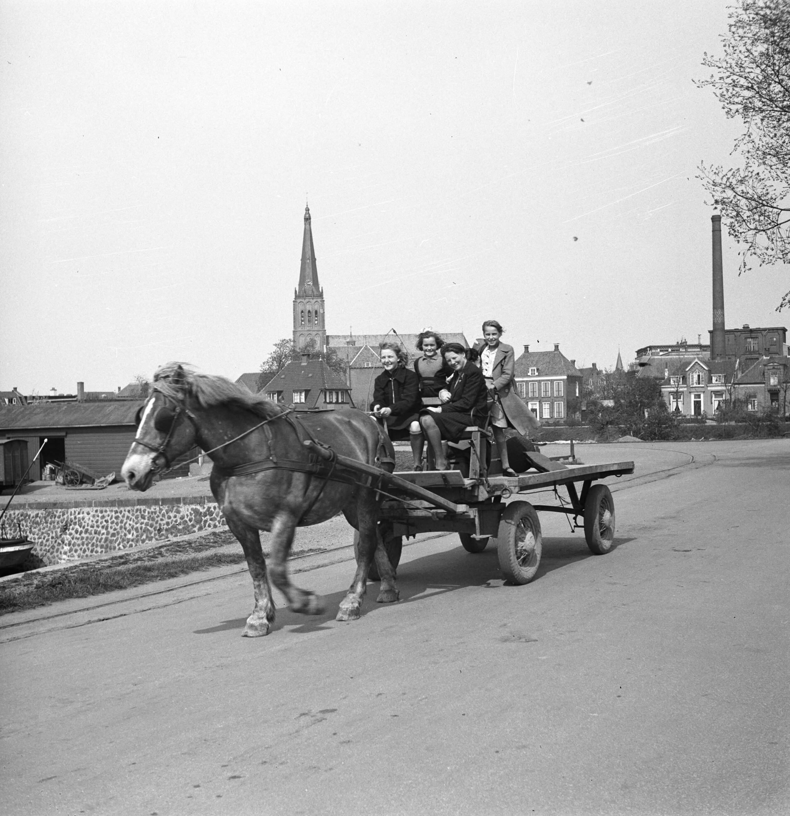 Gezelschap op een boerenkar stiefdochter Renée Bos (links) haalde met mevr. Hesselink-Veenink en twee dochters haar ouders op bij het station Dieren. Doesburg met de toren van de Martinikerk hier op de achtergrond. Links de haven van Doesburg