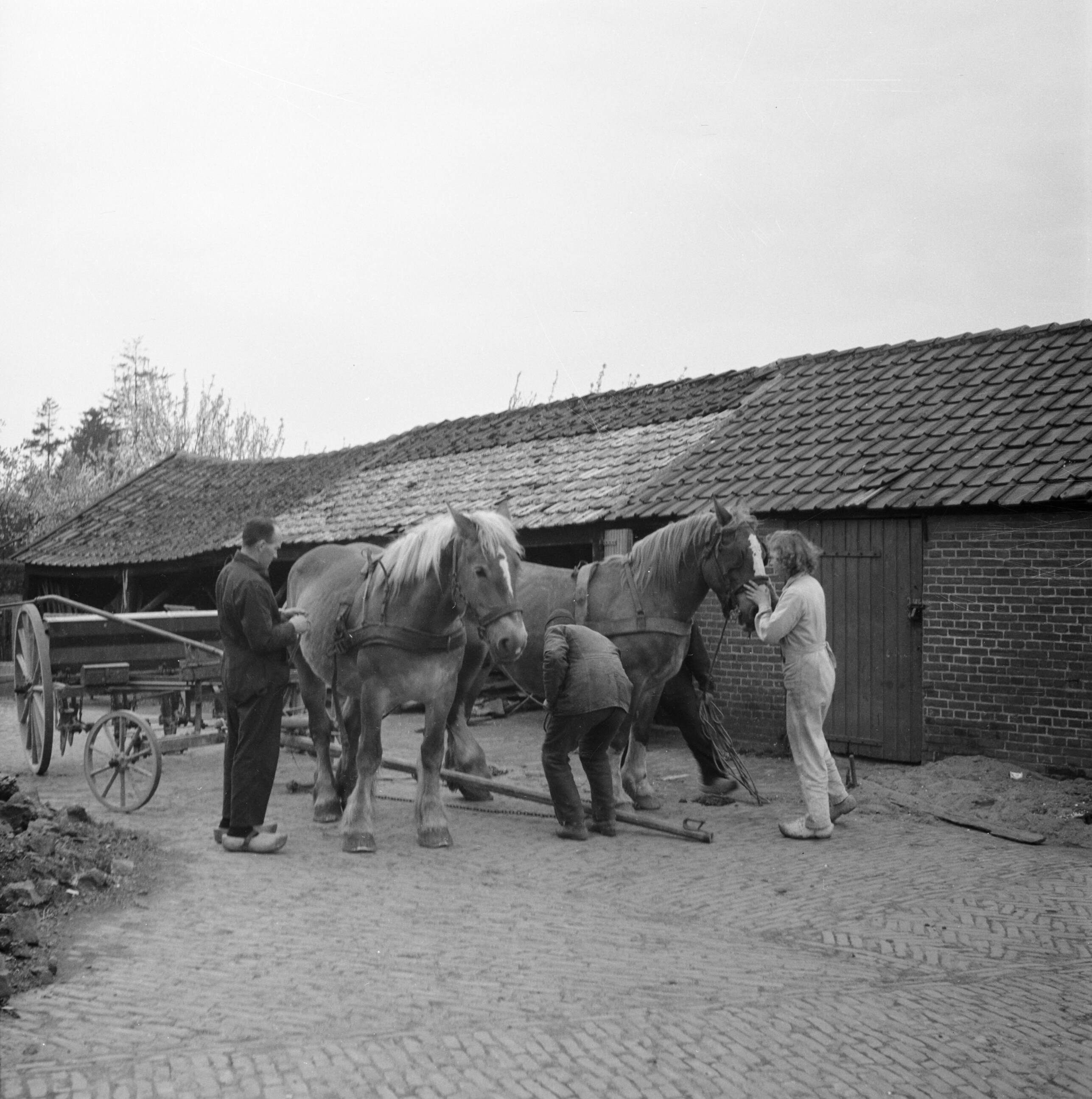Paarden worden ingespannen door Boer Hesselnk en Renée Bos, geholpen door twee knechten