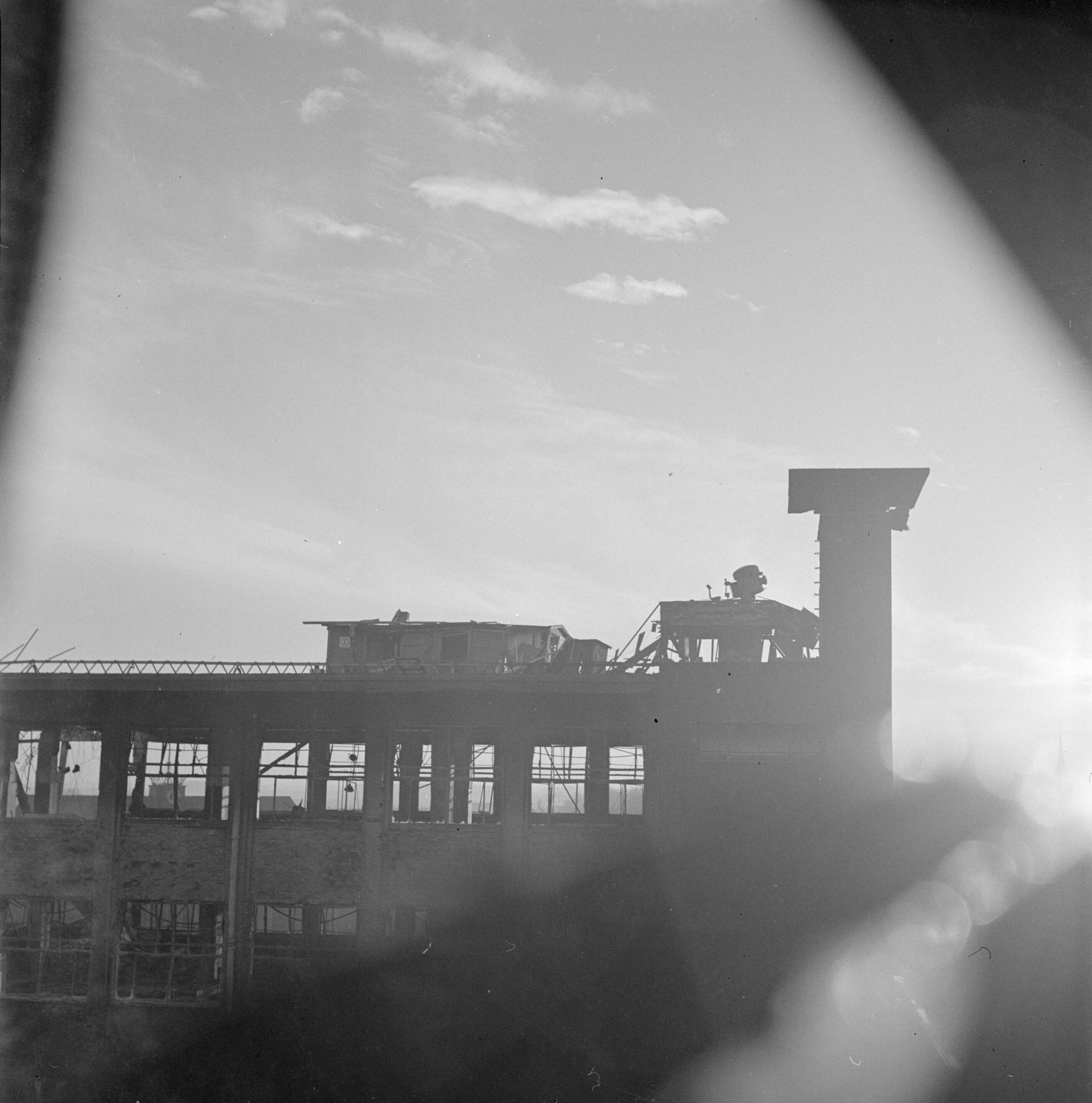 Beschadigd Duits afweergeschut op het dak van de Philips bedrijfsschool na oorlogshandelingen rond Eindhoven