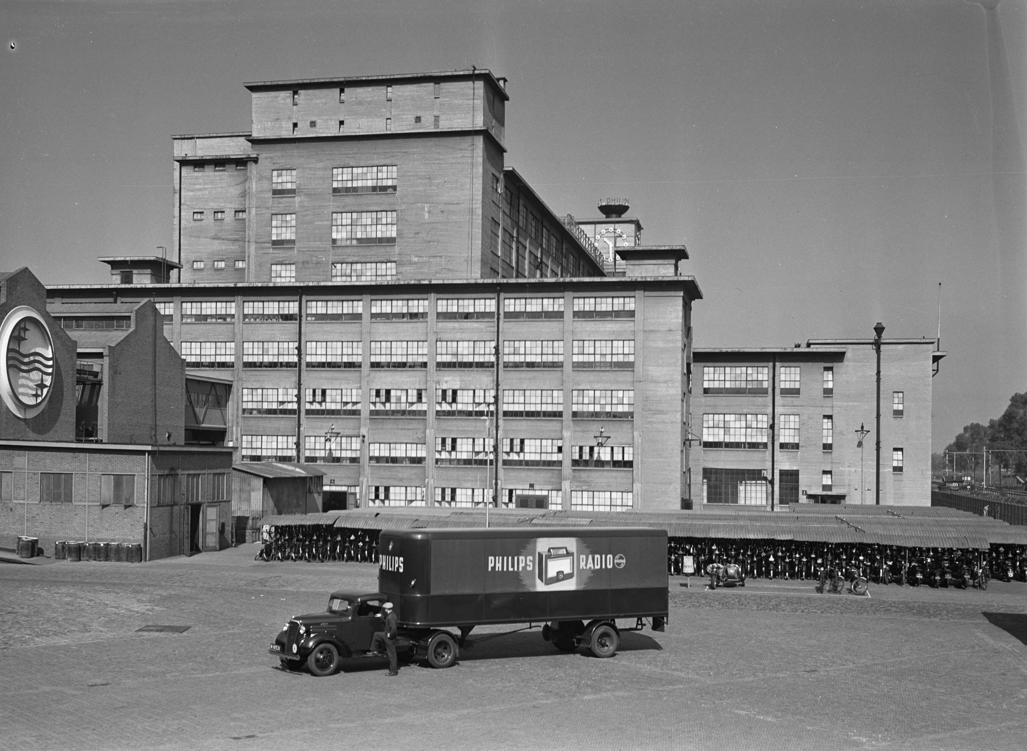 Exterieur van de Philipsfabriek met op de voorgrond een vrachtwagen