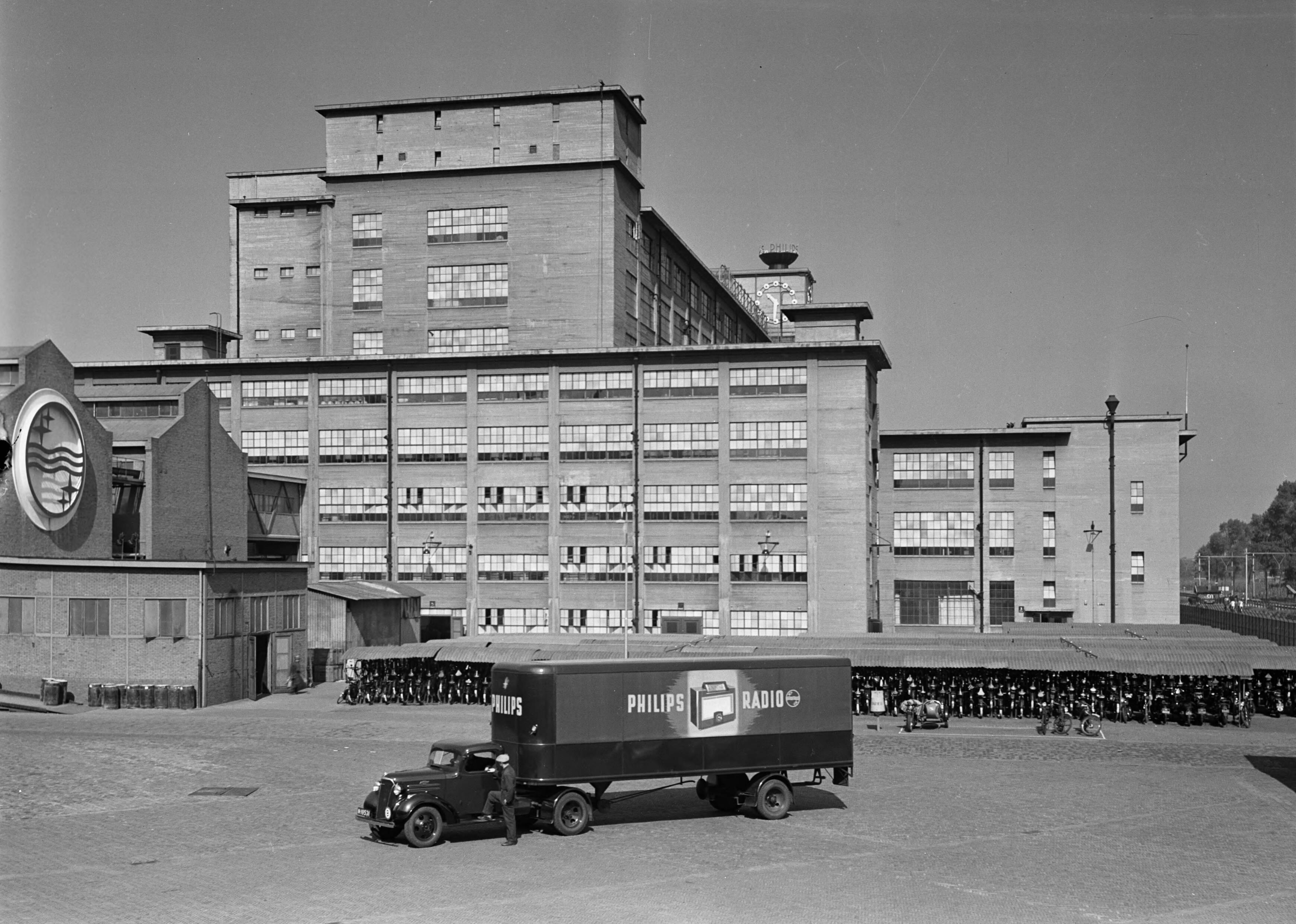 Exterieur van de Philipsfabriek met op de voorgrond een vrachtwagen