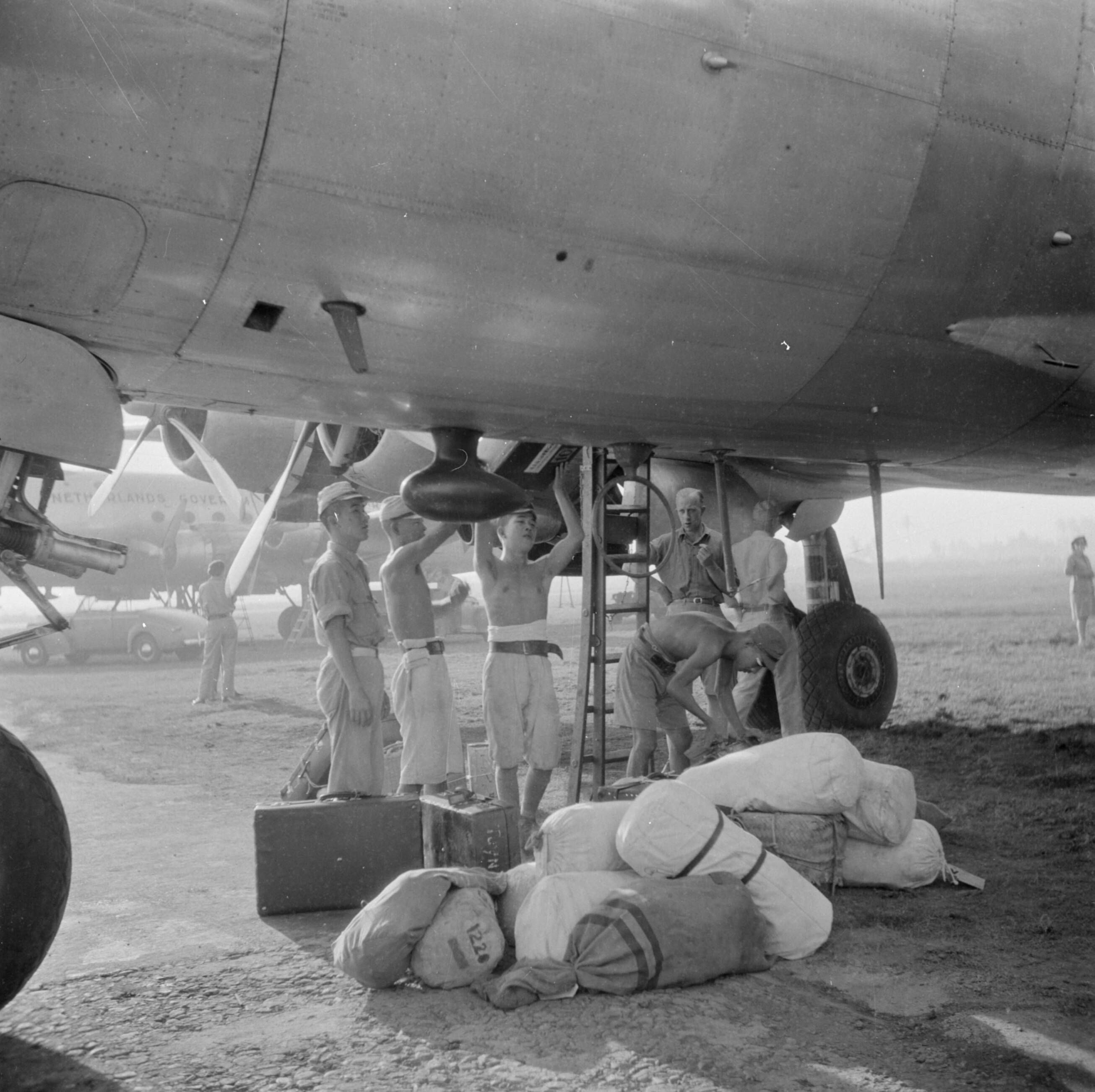 Het lossen en laden van de vliegtuigen op vliegveld Kemajoran door Japanse krijgsgevangenen