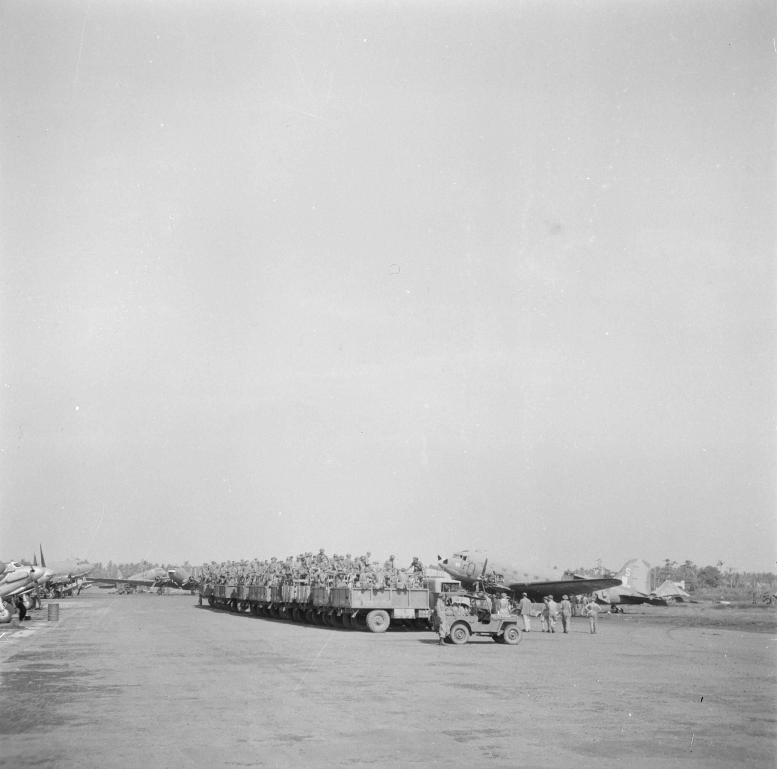 Vervoer in vrachtauto's van de uit Malakka aangekomen militairen naar het vliegveld gebracht om van Batavia naar Bandoeng te gaan