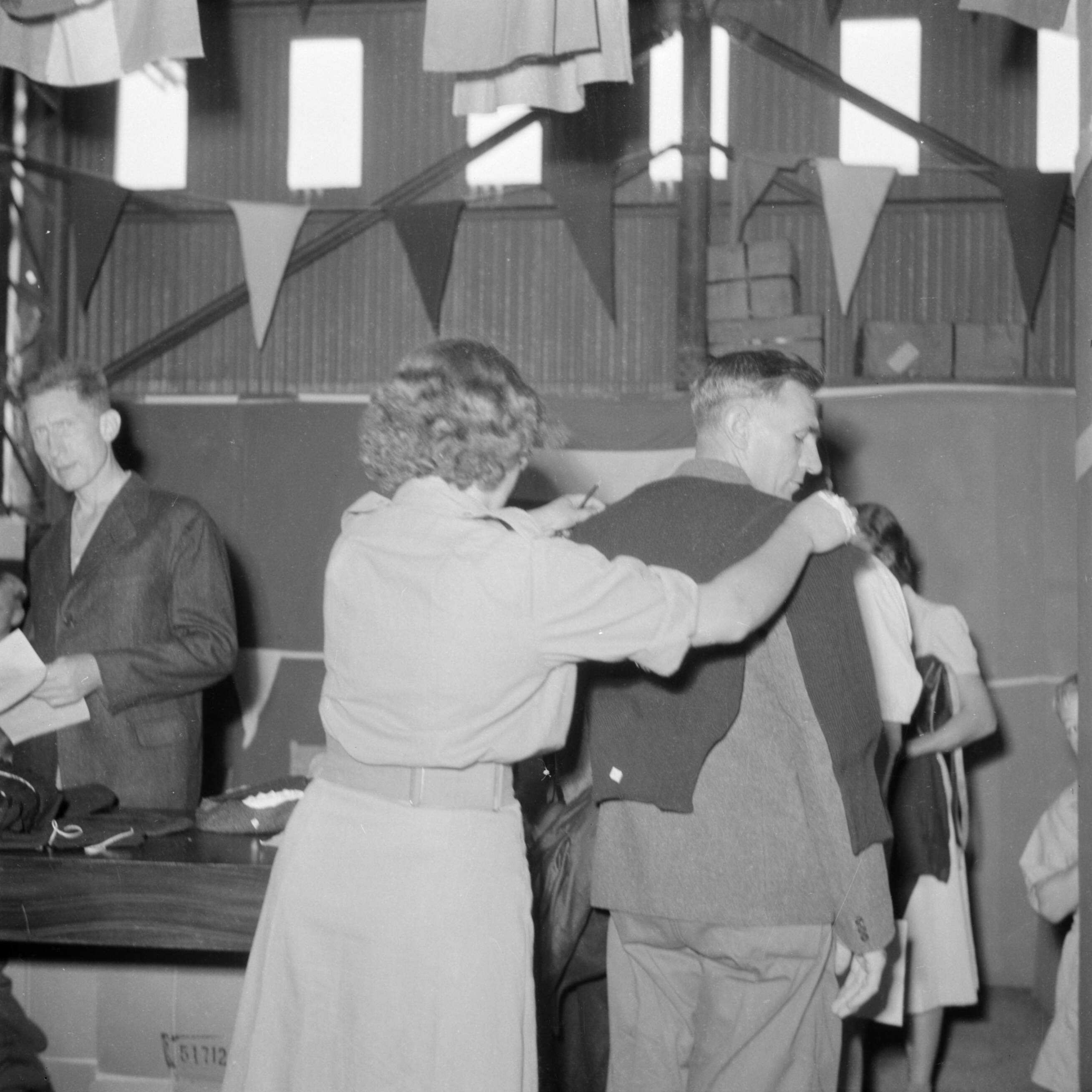 Nederlandse repatrianten krijgen kleding uitgereikt in het kledingcentrum in Ataka (Egypte)