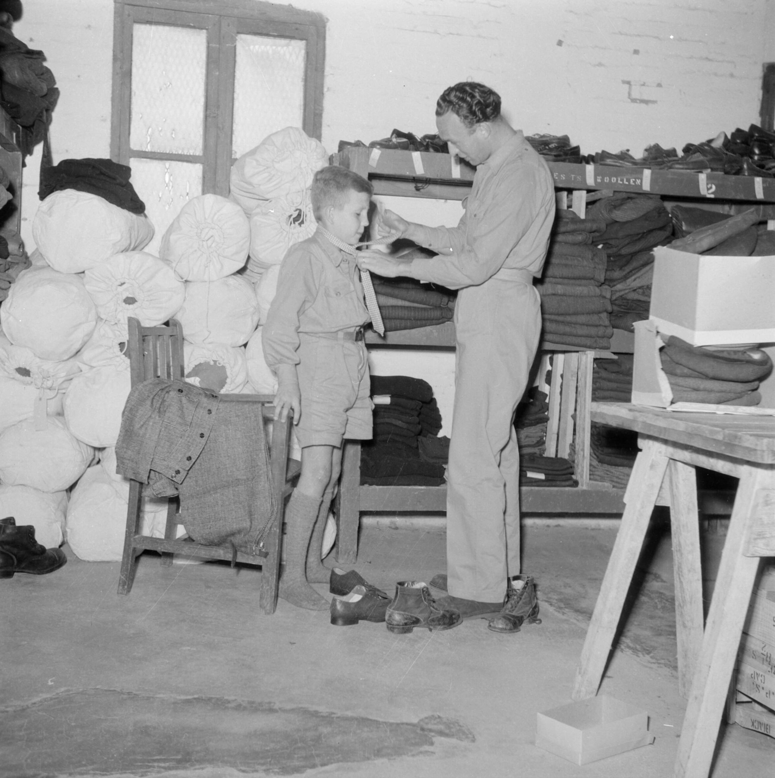 Een gerepatrieerde jongen krijgt kleding uitgereikt in het kledingcentrum in Ataka