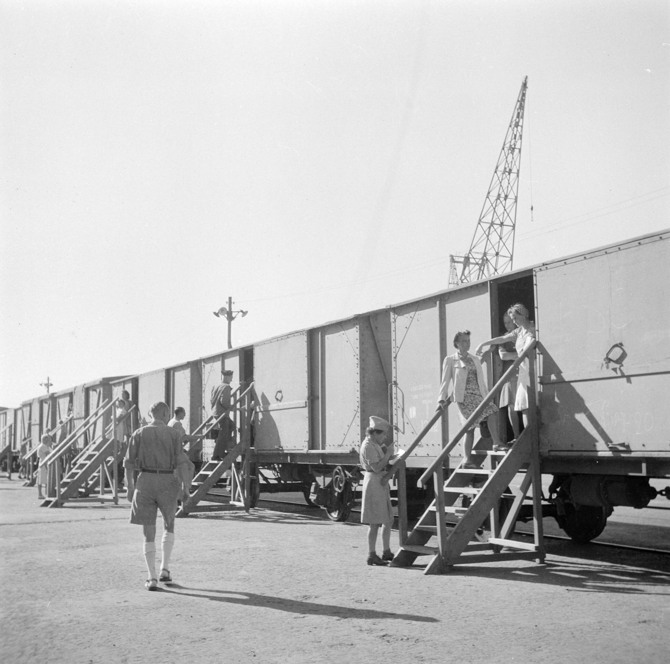 De trein die de repatrianten vervoert tussen de haven van Ataka en het kledingcentrum