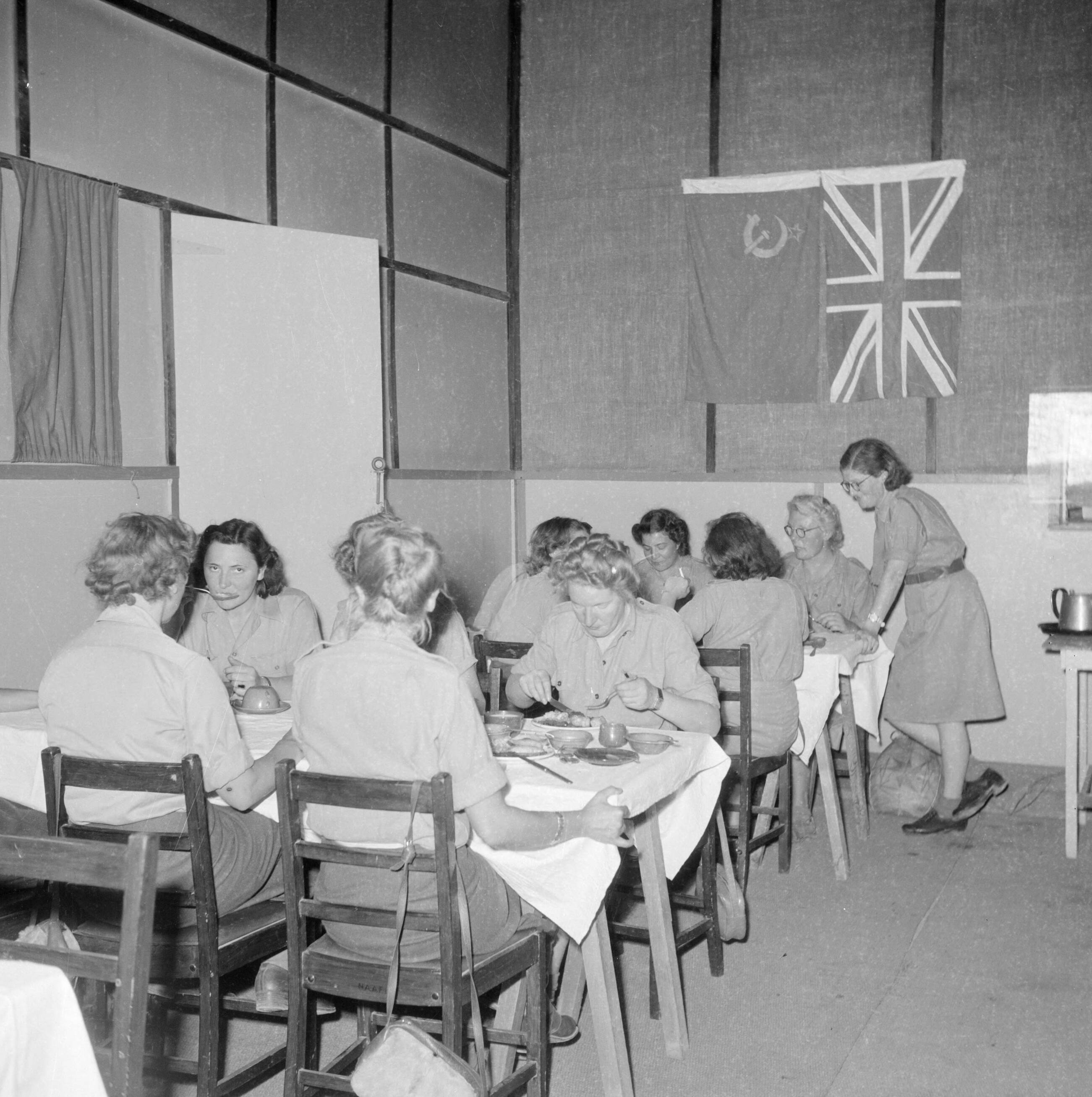 De eetzaal van het Vrouwelijk Hulp Korps in het kledingcentrum in Ataka