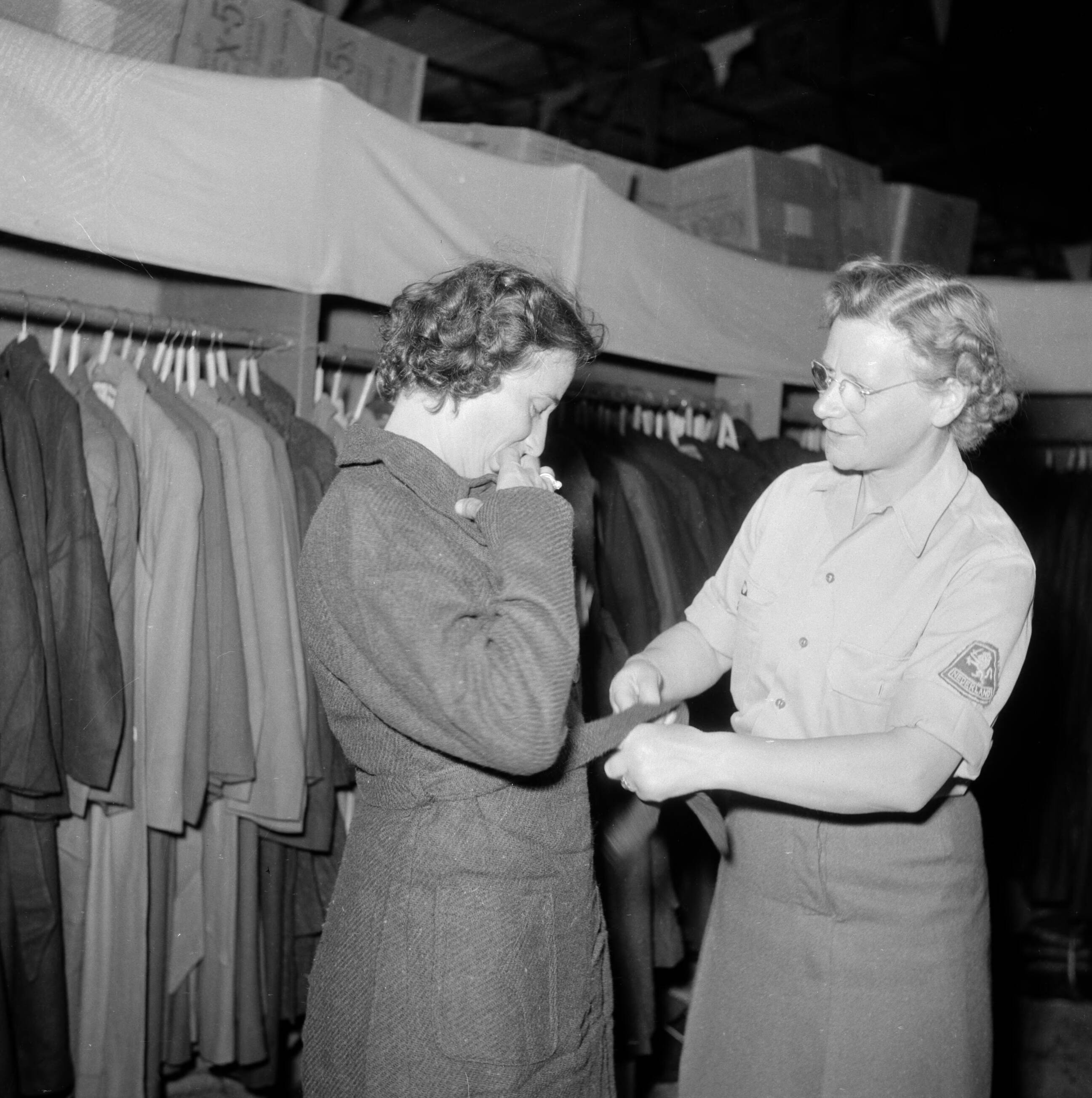 Het kledingcentrum in Ataka een vrouw past een overjas, bijgestaan door een lid van het Vrouwen Hulp Korps
