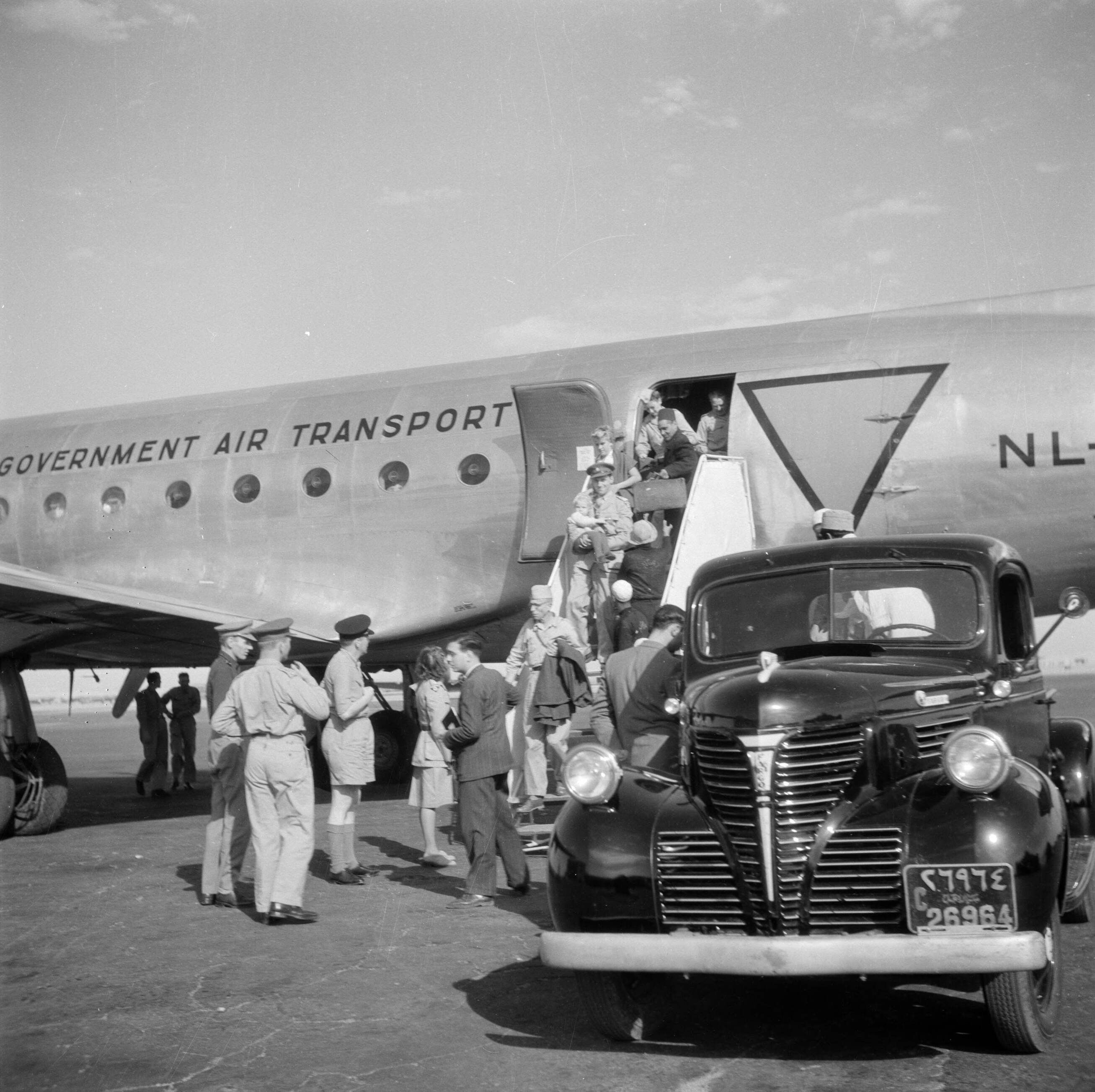 Aankomst van medewerkers van de NICA (Netherlands Indies Civil Administration) op het vliegveld Kemajoran