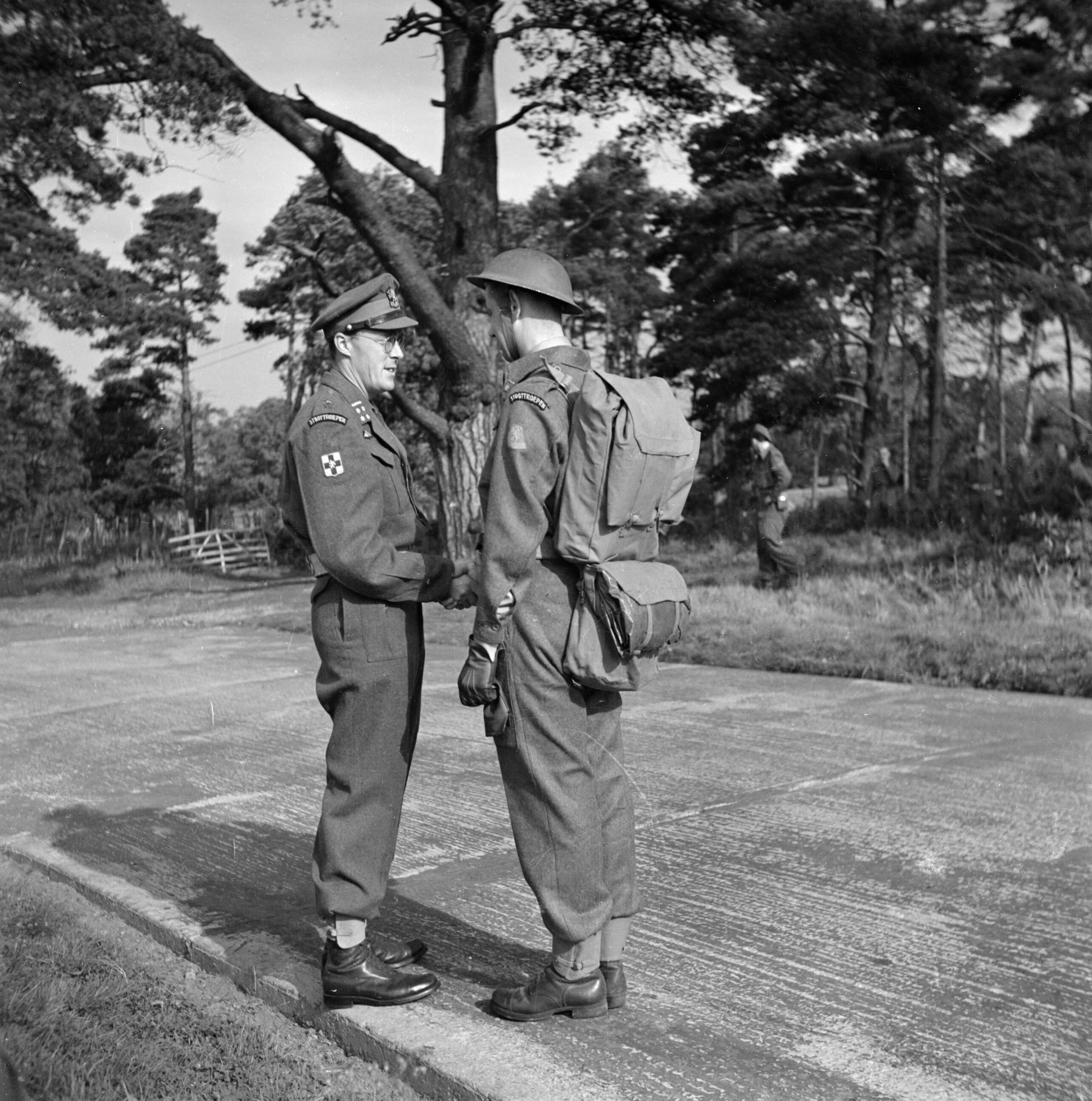 Prins Bernhard schudt een soldaat van het regiment Stoottroepen de hand