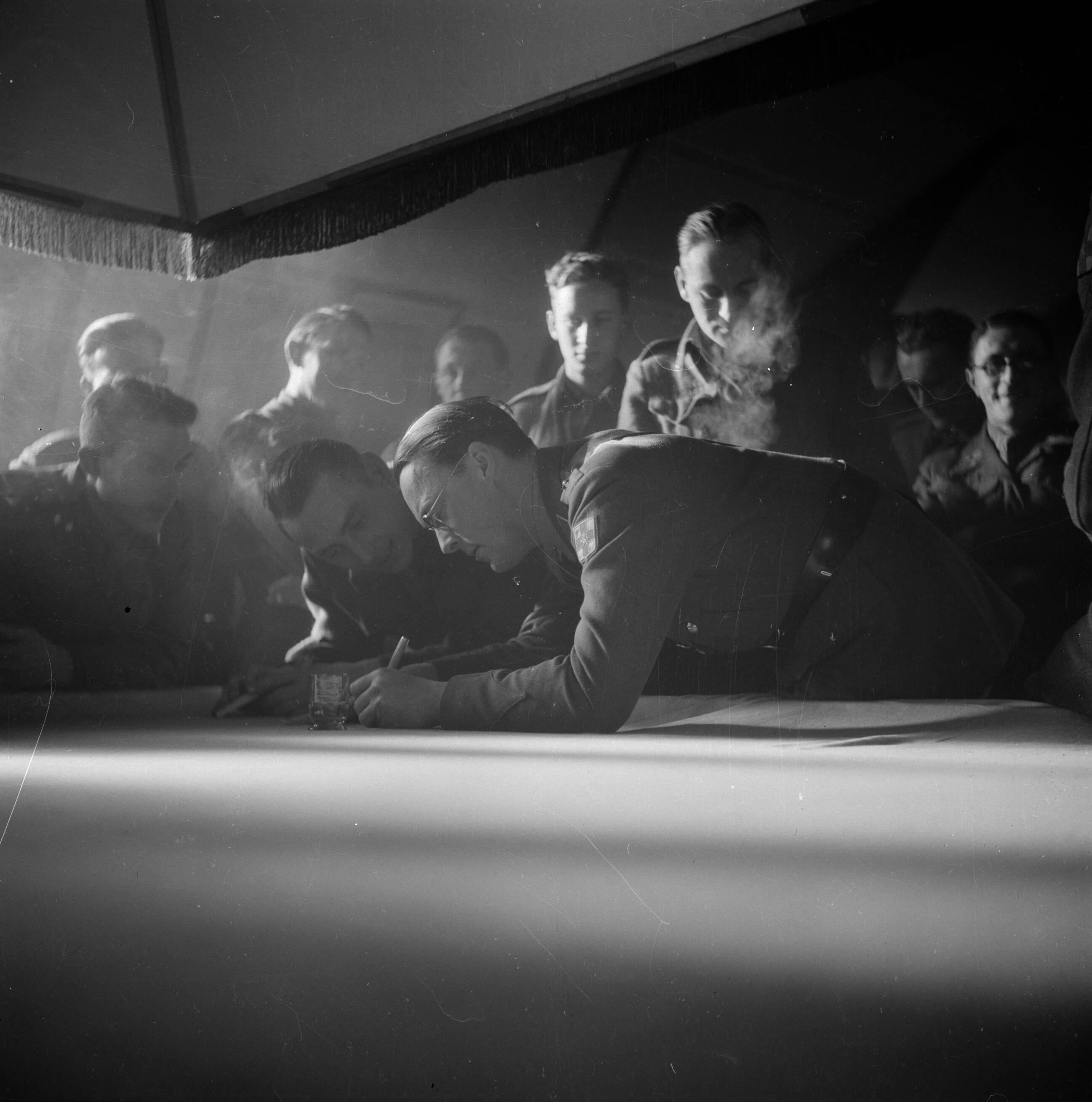 Prins Bernhard buigt zich met een militair over de kaartentafel