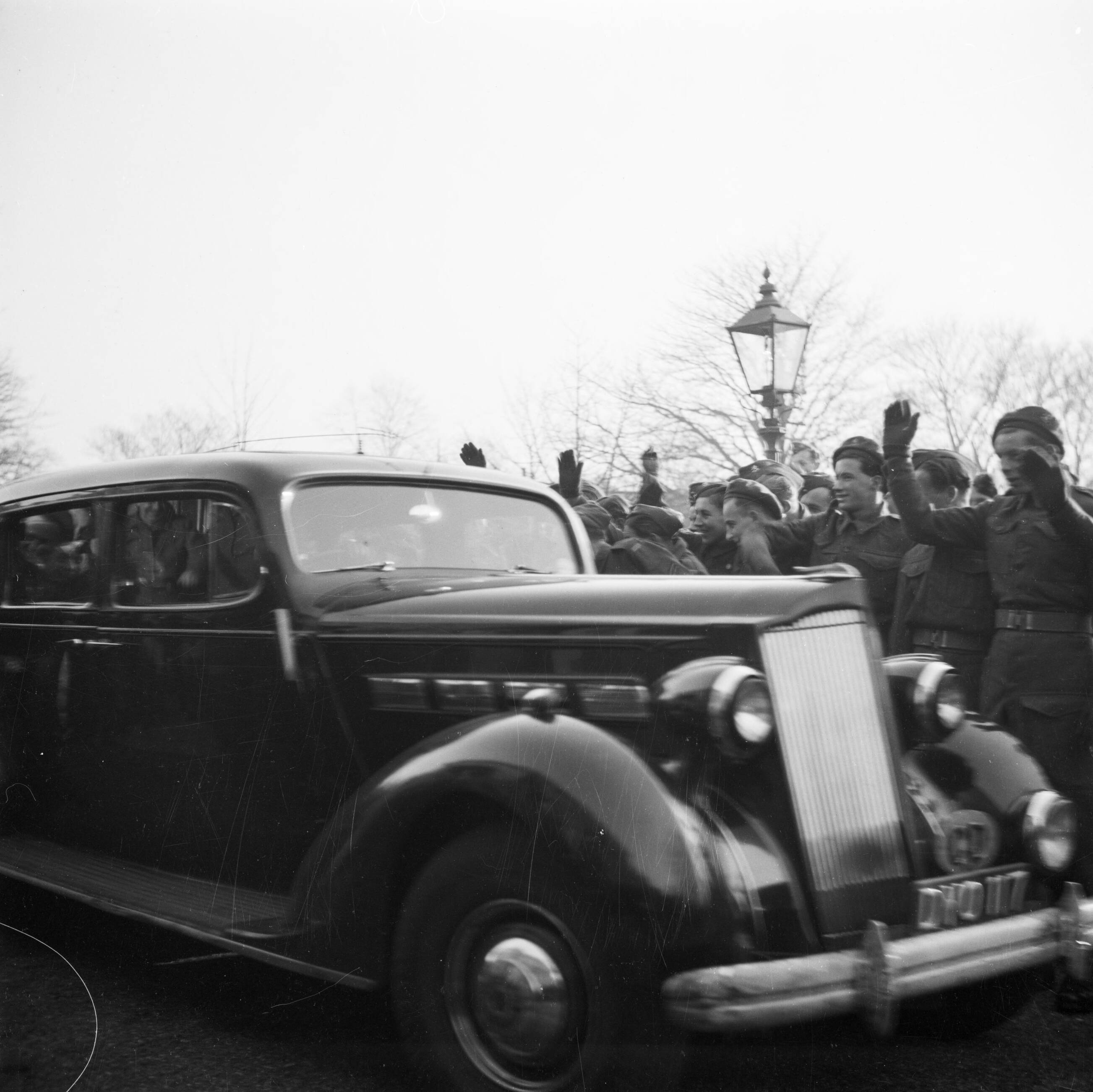 Prins Bernhard verlaat na zijn bezoek per auto de legerbasis