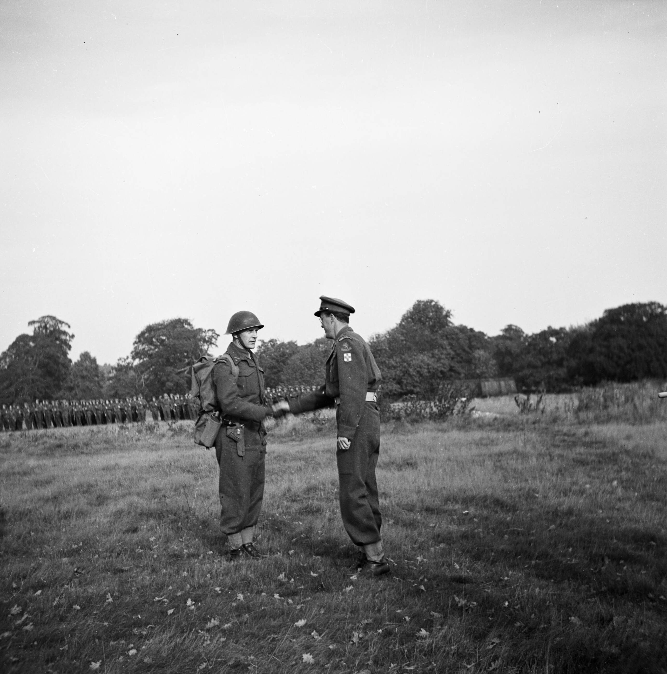 Prins Bernhard schudt een militair de hand