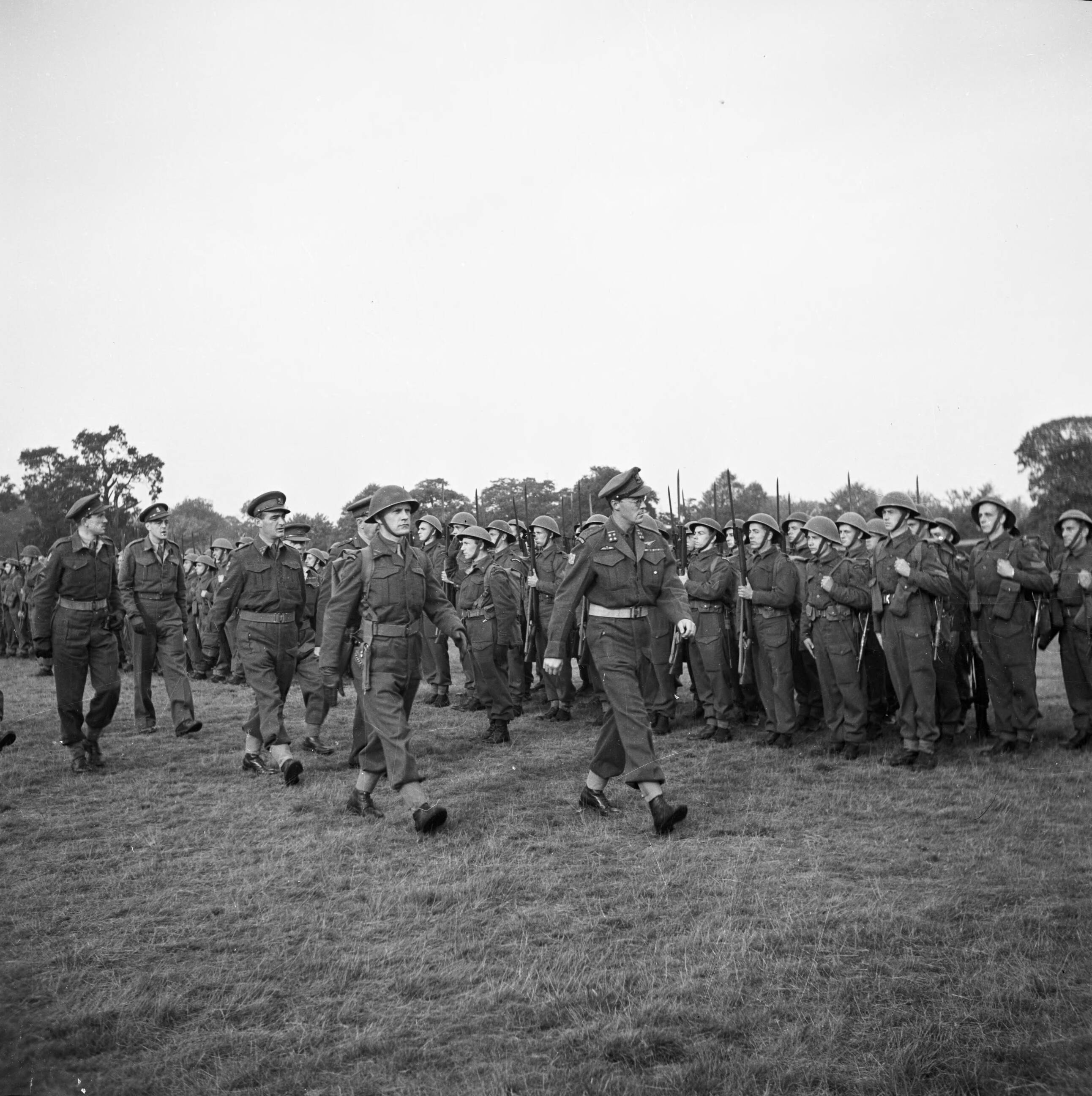 Prins Bernhard inspecteert de opgestelde militairen