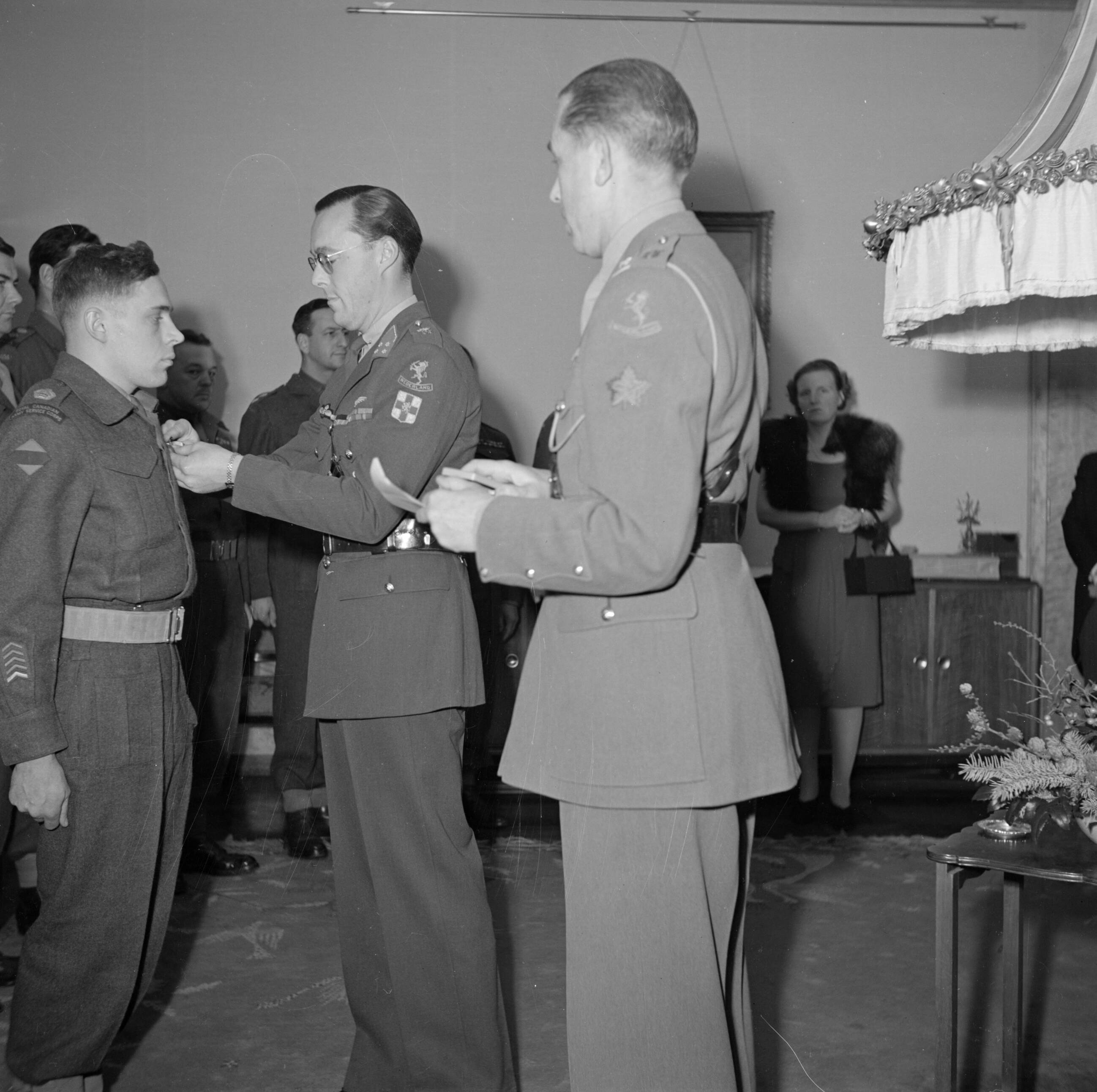 Prind Bernhard speldt een Canadese militair een onderscheiding op