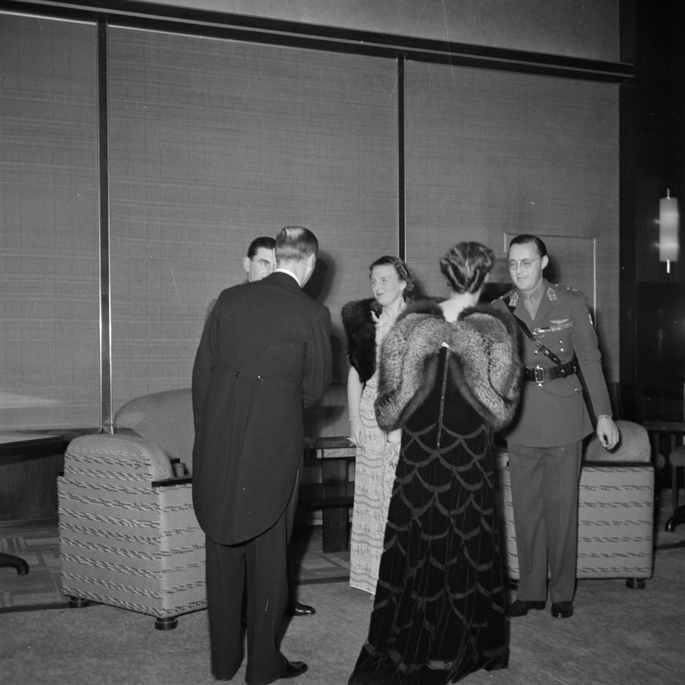 Prinses Juliana, prins Bernhard en generaal Simonds begroeten de gasten