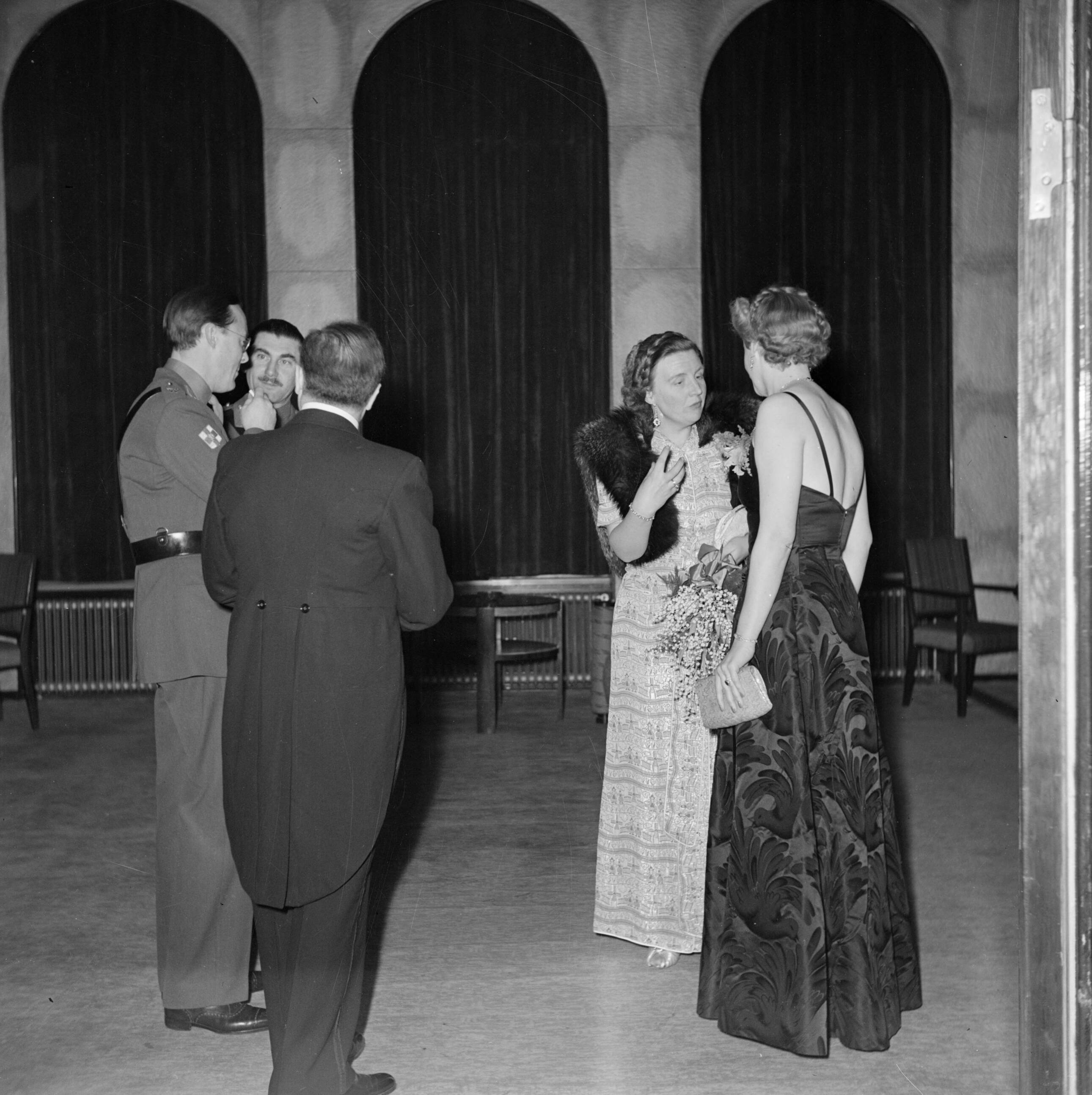 Prinses Juliana en prins Bernhard in gesprek met generaal Simonds en zijn vrouw